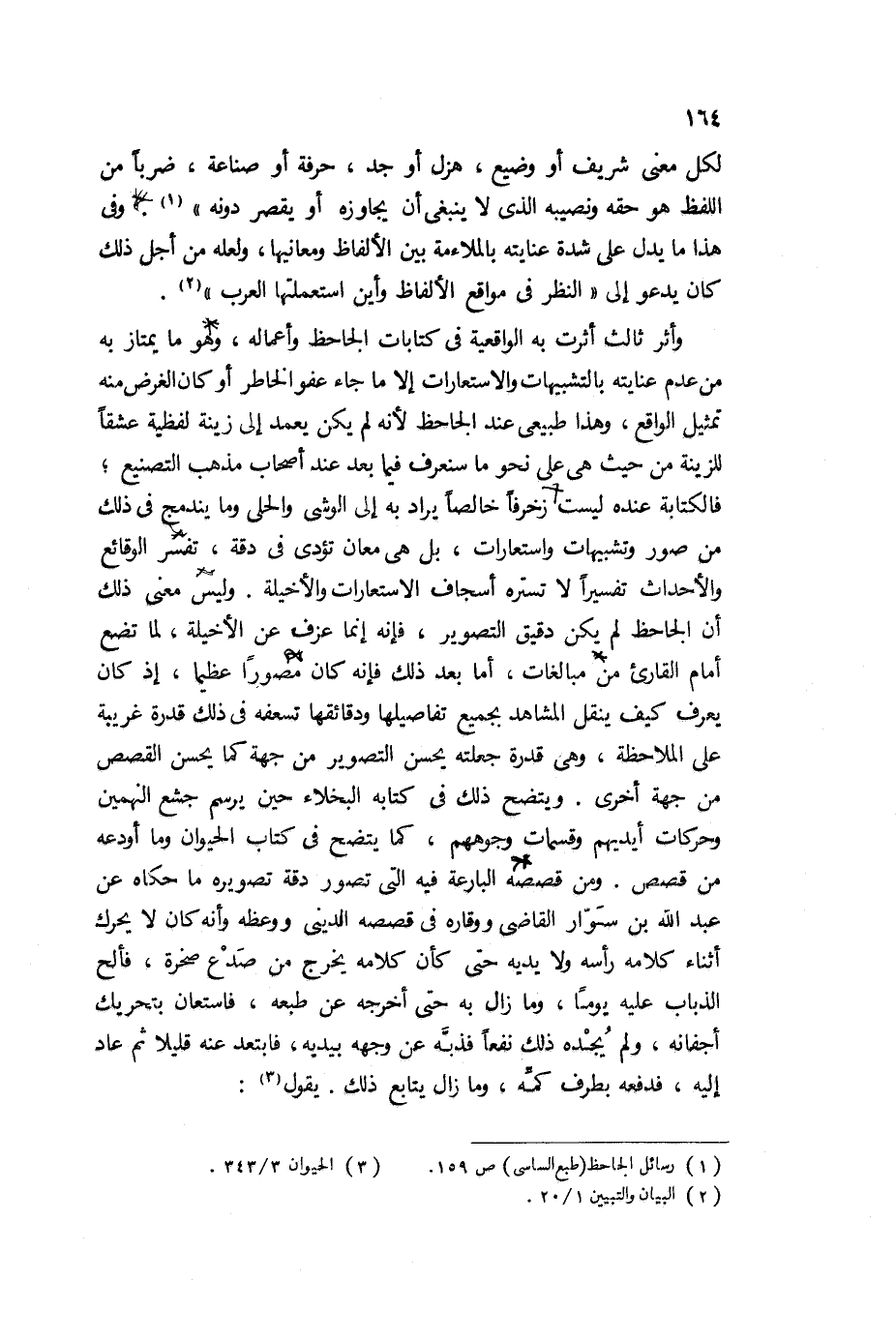وأثر ثالث أثرت به الواقعية في كتابات الجاحظ وأعماله، وهو ما يمتاز به من عدم عنايته بالتشبيهات، والاستعارات إلا ما جاء عفو الخاطر، أو كان الغرض منه تمثيل الواقع، وهذا طبيعي عند الجاحظ؛ لأنه لم يكن يعمد إلى زينة لفظية عشقا للزينة من حيث هي على نحو ما سنعرف فيما بعد عند أصحاب مذهب التصنيع، فالكتابة عنده ليست زخرفا خالصًا يراد به إلى الوشي، والحلي، وما يندمج في ذلك من صور، وتشبيهات، واستعارات، بل هي معان تؤدى في دقة، تفسر الوقائع، والأحداث تفسيرًا لا تستره أسجاف الاستعارات والأخيلة، وليس معنى ذلك أن الجاحظ لم يكن دقيق التصوير، فإنه إنما عزف عن الأخيلة، لما تضع أمام القارئ من مبالغات، أما بعد ذلك، فإنه كان مصورًا عظيمًا، إذ كان يعرف كيف ينقل المشاهد بجميع تفاصيلها، ودقائقها تسعفه في ذلك قدرة غريبة على الملاحظة، وهي قدرة جعلته يحسن التصوير من جهة كما يحسن القصص من جهة أخرى، ويتضح ذلك من كتابه البخلاء حين يرسم جشع النهمين، وحركات أيديهم، وقسمات وجوههم، كما يتضح في كتاب الحيوان وما أودعه من قصص، ومن قصصه البارعة فيه التي تصور دقة تصويره ما حكاه عن عبد الله بن سوار القاضي، ووقاره في قصصه الديني ووعظه، وأنه كان لا يحرك أثناء كلامه رأسه ولا يديه حتى كأن كلامه يخرج من صدع صخرة، فألح الذباب عليه يومًا، وما زال به حتى أخرجه عن طبعه، فاستعان يتحرك أجفانه، ولم يجده ذلك نفعا فذبه عن وجهه بيديه، فابتعد عنه قليلا ثم عاد إليه، فدفعه بطرف كمه، وما زال يتابع ذلك، يقول3: