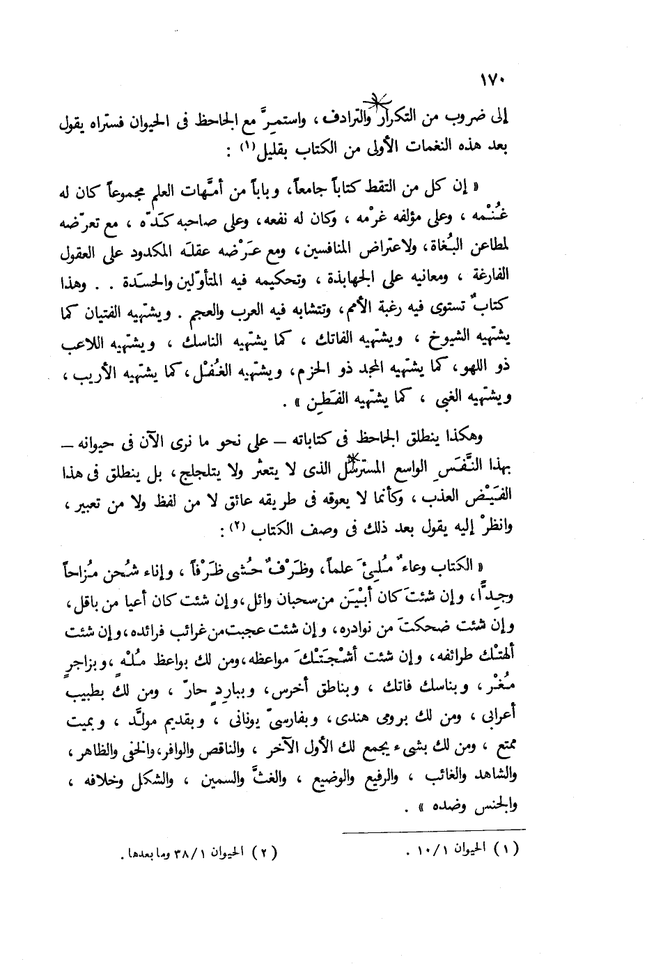 وهكذا ينطلق الجاحظ في كتاباته -على نحو ما نرى الآن في حيوانه- بهذا النفس الواسع المسترسل الذي لا يتعثر ولا يتلجلج، بل ينطلق في هذا الفيض العذب، وكأنما لا يعوقه في طريقة عائق لا من لفظ، ولا من تعبير، وانظر إليه يقول بعد ذلك في وصف الكتاب2: