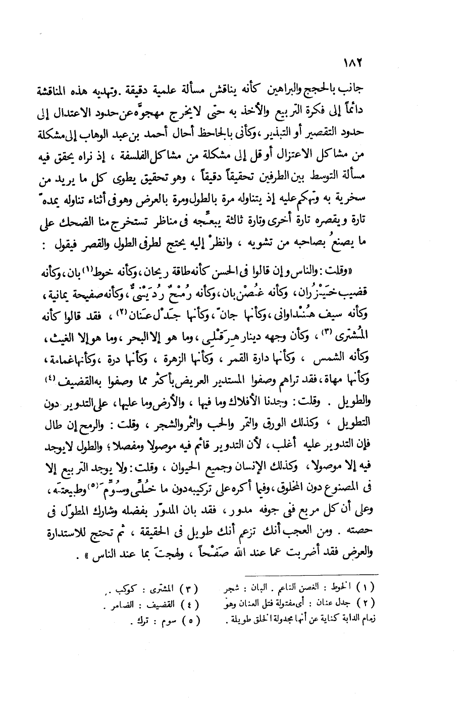"وقلت: والناس وإن قالوا في الحسن: كأنه طاقة ريحان، وكأنه خوط1 بان، وكأنه قضيب خيزران، وكأنه غصن بان، وكأنه رمح رديني، وكأنه صفيحة يمانية، وكأنه سيف هندواني، وكأنها جان، وكأنها جدل عنان2، فقد قالوا: كانه المشتري3، وكأن وجهه دينار هرقلي، وما هو إلا البحر، وما هو إلا الغيث، وكأنه الشمس، وكأنها دارة القمر، وكأنها الزهرة، وكأنها درة، وكأنها غمامة، وكأنها مهاة، فقد تراهم وصفوا المستدير العريض بأكثر مما وصفوا به القضيف4 والطويل. وقلت: وجدنا الأفلاك وما فيها، والأرض وما عليها، على التدوير دون التطويل، وكذلك الورق والتمر والحب والثمر والشجر، وقلت: والرمح إن طال، فإن التدوير عليه أغلب؛ لأن التدوير قائم فيه موصولًا ومفصلًا؛ والطول لا يوجد فيه إلا موصولا، وكذلك الإنسان وجميع الحيوان، وقلت: ولا يوجد التربيع إلا في المصنوع دون المخلوق، وفيما كره على تركيبه دون ما خلي وسوم5 وطبيعته، وعلى أن كل مربع ففي جوفه مدور، فقد بان المدور بفضله، وشارك المطول في حصته، ومن العجب أنك تزعم أنك طويل في الحقيقة، ثم تحتج للاستدارة والعرض، فقد أضربت عما عند الله صفحًا، ولهجت بما عند الناس".