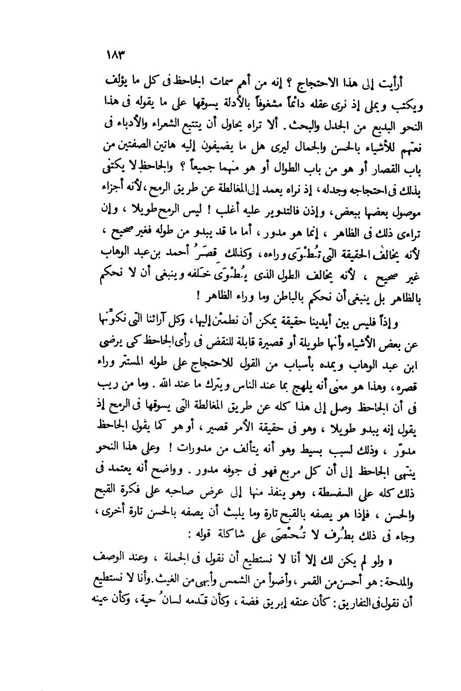 أرأيت إلى هذا الاحتجاج؟ إنه من أهم سمات الجاحظ في كل ما يؤلف، ويكتب ويملي إذ نرى عقله دائمًا مشغوفًا بالأدلة يسوقها على ما يقوله في هذا النحو البديع من الجدل والبحث، ألا تراه يحاول أن يتتبع الشعراء والأدباء في نعتهم للأشياء بالحسن، والجمال ليرى هل ما يضيفون إليه هاتين الصفتين من باب القصار، أو هو من باب الطوال، أو هو منهما جميعًا؟ والجاحظ لا يكتفي بذلك في احتجاجه وجدله، إذ نراه يعمد إلى المغالطة عن طريق الرمح؛ لأنه أجزاء موصول بعضها ببعض، وإذن فالتدوير عليه أغلب! ليس الرمح طويلًا، وإن تراءى ذلك في الظاهر، إنما هو مدور، أما ما قد يبدو من طوله فغير صحيح؛ لأنه يخالف الحقيقة التي تطوى وراءه، وكذلك قصر أحمد بن عبد الوهاب غير صحيح؛ لأنه يخالف الطول الذي يطوى خلفه، وينبغي أن لا نحكم بالظاهر، بل ينبغي أن نحكم بالباطن، وما وراء الظاهر!