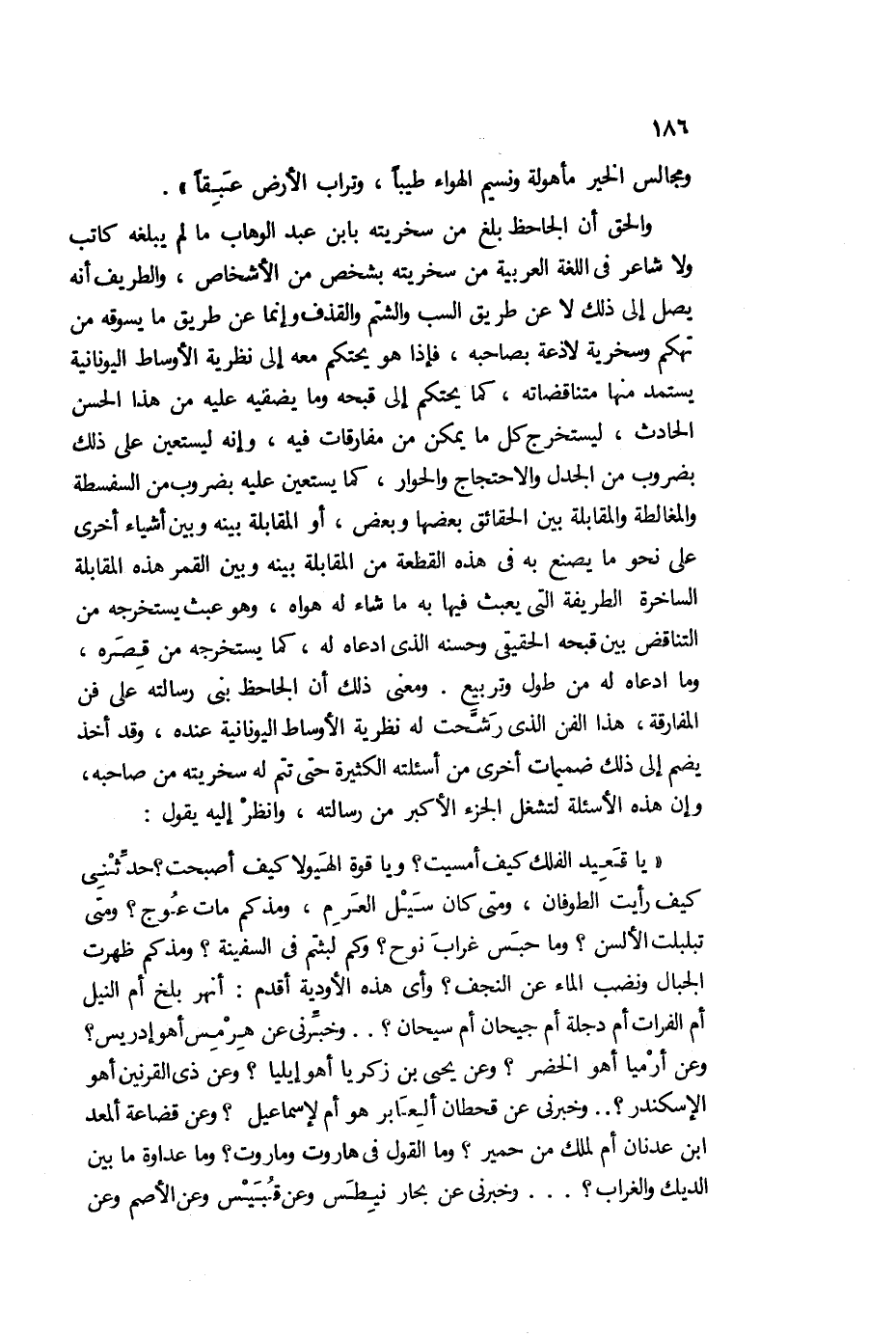 والحق أن الجاحظ بلغ من سخريته بابن عبد الوهاب ما لم يبلغه كاتب، ولا شتعر في اللغة العربية من سخريته بشخص من الأشخاص، والطريف أنه يصل إلى ذلك لا عن طريق السب، والشتم، والقذف، وإنما عن طريق ما يسوقه من تهكم وسخرية لاذعة بصاحبه، فإذا هو يحتكم معه إلى نظرية الأوساط اليونانية يستمد منها متناقضاته، كما يحتكم إلى قبحه، وما يضفيه عليه من هذا الحسن الحادث، ليستخرج كل ما يمكن من مفارقات فيه، وإنه يستعين على ذلك بضروب من الجدل والاحتجاج والحوار، كما يستعين عليه بضروب من السفسطة، والمغالظة، والمقابلة بين الحقائق بعضها وبعض، أو المقابلة بينه وبين أشياء أخرى على نحو ما يصنع به في هذه القطعة من المقابلة بينه، وبين القمر هذه المقابلة الساخرة الطريفة، التي يبعث فيها به ما شاء له هواه، وهو عبث يستخرجه من التناقض بين قبحه الحقيقي، وحسنه الذي ادعاه له، كما يستخرجه من قصره، وما ادعاه له من طول وتربيع، ومعنى ذلك أن الجاحظ بنى رسالته على فن المفارقة، هذا الفن الذي رشحت له نظرية الأوساط اليونانية عنده، وقد أخذ يضم إلى ذلك ضميمات أخرى من أسئلته الكثيرة، حتى تتم له سخريته من صاحبه، وغن هذه الأسئلة لتشغل الجزء الأكبر من رسالته، وانظر إليه يقول: