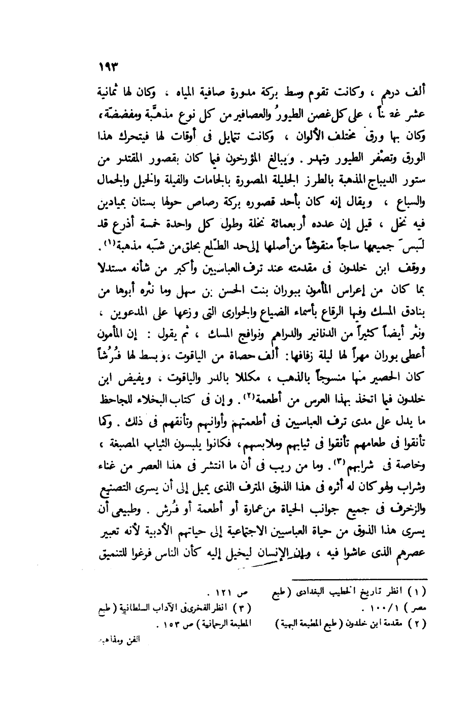 ووقف ابن خلدون في مقدمته عند ترف العباسيين، وأكبر من شأنه مستدلا بما كان من إعراس المأمون ببوران بنت الحسن بن سهل، وما نثره أبوها من بنادق المسك، وفيها الرقاع بأسماء الضياع، والجواري التي وزعها على المدعوين، ونثر أيضًا كثيرًا من الدنانير، والدراهم ونوافج المسك، ثم يقول: إن المأمون أعطى بوران مهرًا لها ليلة زفافها: ألف حصاة من الياقوت، وبسط لها فرشا كان الحصير منها منسوجا بالذهب، مكللا بالدر والياقوت، ويفيض ابن خلدون فيما اتخذ بهذا العرس من أطعمة2، وإن في كتاب البخلاء للجاحظ ما يدل على مدى ترف العباسيين في أطعمتهم، وأوانيهم، وتأنقهم في ذلك، وكما تأنقوا في طعامهم تأنقوا في ثيابهم، وملابسهم، فكانوا يلبسون الثياب المصبغة، وخاصة في شرابهم3، وما من ريب في أن ما انتشر في هذا العصر من غناء وشراب، ولهو كان له أثره في هذا الذوق المترف الذي يميل إلى أن يسري التصنيع، والزخرف في جيمع جوانب الحياة من عمارة، أو أطعمة أو فرش، وطبيعي أن يسري هذا الذوق من حياة العباسيين الاجتماعية إلى حياتهم الأدبية؛ لأنه تعبير عصرهم الذي عاشوا فيه، وإن الإنسان ليخل له كأن الناس فرغوا للتنميق والتصنيع، فهم يصنعون وينمقون في دورهم، وفي ملابسهم وفي طعامهم، وفي كل ما يتصل بهم.