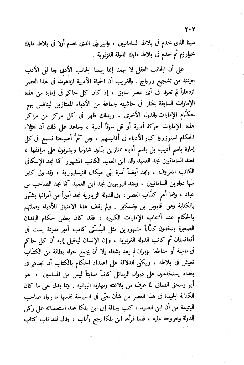 على أن الجانب العقلي لا يهمنا، إنما يهمنا الجانتب الأدبي، وما لقي الأدب حينئذ من تشجيع ورواج، والغريب أن الحياة الأدبية ازدهرت في هذا العصر ازدهارًا لم تعرف في أي عصر سابق، إذ كان كل حاكم في إمارة من هذه الإمارات السابقة، يختار في حاشيته جماعة من الأدباء الممتازين لينافس بهم حكام الإمارات، والدول الأخرى، وبذلك ظهر في كل مركز من مراكز هذه الإمارات حركة أدبية، أو قل سوقًا أدبية، وساعد على ذلك أن هؤلاء الحكام استوزروا كبار الأدباء في أقاليمهم، ومن ثَمَّ أصبحنا نسمع في كل إمارة باسم أديب بل باسم أدباء ممتازين يلون شئونها، ويشرفون على مرافقها، فعند السامانيين نجد العميد والد ابن العميد الكاتب المشهور، كما نجد الإسكافي الكاتب المعروف، ونجد أيضا أسرة بني ميكال النيسابورية، وقد ولي كثير منها دواوين السامانيين، وعند البويهيين نجد ابن العميد كما نجد الصاحب بن عباد، وهما أهم كتاب العصر، وفي الدولة الزيارية نجد أميرًا من أمرائها يشتهر بالكتابة، وهو قابوس بن وشمكير، ولم يقف هذا الامتياز للأدباء، وصلتهم بالحكام عند أصحاب الإمارات الكبيرة، فقد كان بعض حكام البلدان الصغيرة يتخذون كتابًا مشهورين، مثل البستي كاتب أمير مدينة بست في أفغاسنتان، ثم كاتب الدولة الغرنوية، وإن الإنسان ليخل إليه أم كل حاكم في مدينة، أو مقاطعة بإيران لم يعد يشغله إلا أن يجمع حوله بطانة من الكتاب تعيش في بلاطه، ويكفي للدلالة على اعتداد الحكام بالكتاب أن نجدهم في بغداد يستخدمون على ديوان الرسائل كاتبًا صابئًا ليس من المسلمين، هو أبو إسحاق الصابي لما عرف من بلاغته، ومهارته البيانية، وما يدل على ما كان للكتابة الجيدة في هذا العصر من شأن حتى في السياسة نفسها، ما رواه صاحب اليتيمة من أن ابن العميد "كتب رسالة إلى ابن بلكا عند استعصائه على ركن الدولة وخروجه عليه، فلما قرأه ابن بلكا رجع وأناب، وقال: لقد ناب كتاب