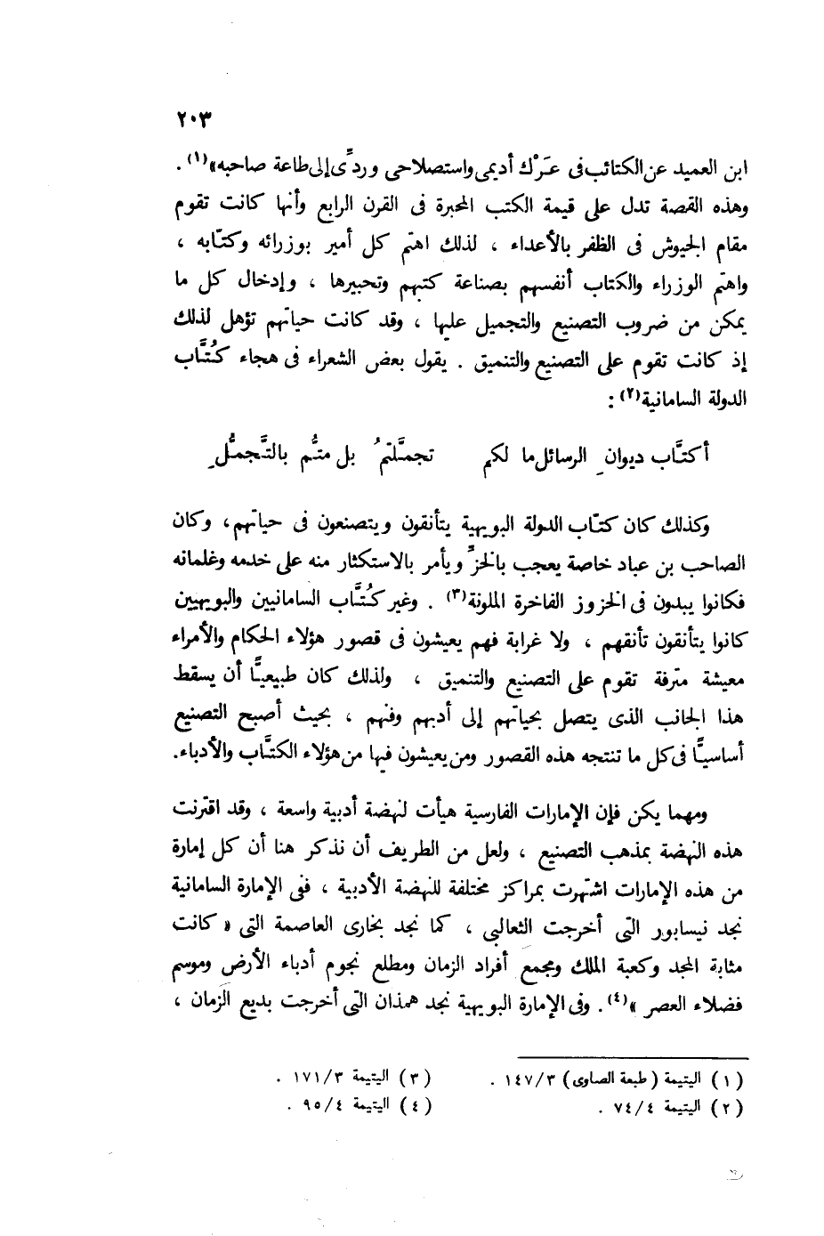 وكذلك كان كتاب الدول البويهية يتأنقون ويتصنعون في حياتهم، وكان الصاحب بن عباد خاصة يعجب بالخز، ويأمر بالاستكثار منه على خدمه وغلمانه، فكانوا يبدون في الخزوز الفاخرة الملونة3، وغير كتاب السامانيين والبويهيين كانوا يتأنقون تأنقهم، ولا غرابة فهم يعيشون في قصور هؤلاء الحكام، والأمراء معيشة مترفة تقوم على التصنيع والتنميق، ولذلك كان طبيعيًا أن يسقط هذا الجانب الذي يتصل بحياتهم إلى أدبهم وفنهم، بحيث أصبح التصنيع أساسيًا في كل ما تنتجه هذه القصور، ومن يعيشون فيها من هؤلاء الكتاب والأدباء.