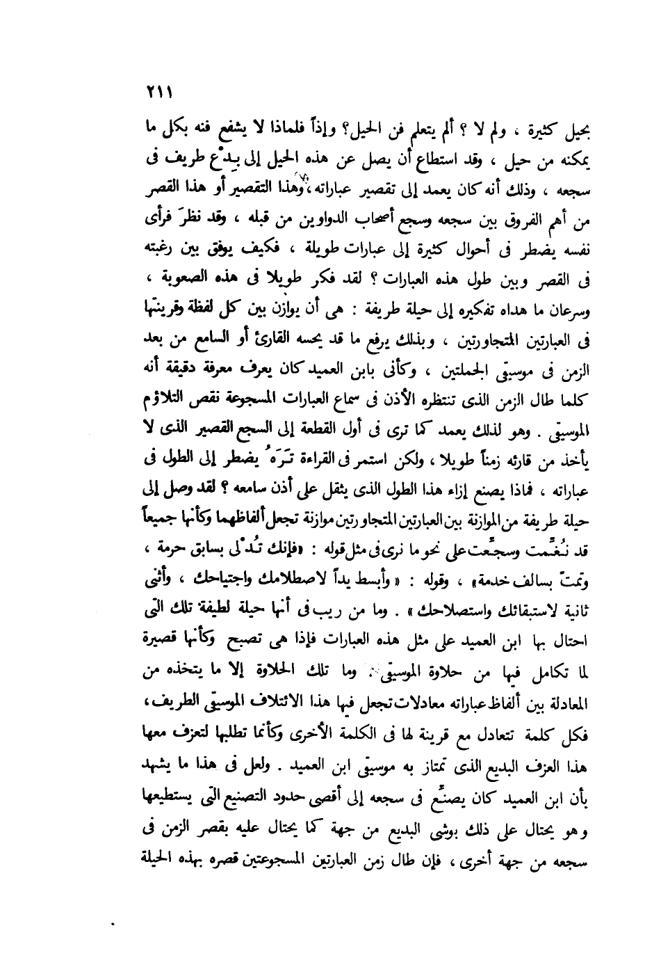 بحيل كثيرة، ولم لا؟ ألم يتعلم فن الحيل؟ وإذا فلماذا لا يشفع فنه بكل ما يمكنه من حيل، وقد استطاع أن يصل عن هذه الحيل إلى بدع طريف في سجعه، وذلك أنه كان يعمد إلى تقصير عباراته، وهذا التقصير، أو هذا القصر من أهم الفروق بين سجعه وسجع أصحاب الدواوين من قبله، وقد نظر فرأى نفسه يضطر في أحوال كثيرة إلى عبارات طويلة، فكيف يوفق بين رغبته في القصر، وبين طول هذه العبارات؟ لقد فكر طويلًا في هذه الصعوبة، وسرعان ما هداه تفكيره إلى حيلة طريفة: هي أن يوازن بين كل لفظة، وقرينتها في العبارتين والمتجاورتين، وبذلك يرفع ما قد يحسه القارئ، أو السامع من بعد الزمن في موسيقى الجملتين، وكأني بابن العميد كان يعرف معرفة دقيقة أنه كلما طال الزمن الذي تنتظره الأذن في سماع العبارات المسجوعة نقص التلاؤم الموسيقى. وهو لذلك يعمد كما ترى في أول القطعة إلى السجع القصير، الذي لا يأخذ من قارئه زمنًا طويلًا، ولكن استمر في القراءة تره يضطر إلى الطول في عباراته، فماذا يصنع إزاء هذه الطول الذي يثقل على أذن سامعه؟ لقد وصل إلى حيلة طريفة من الموازنة بين العبارتين المتجاورتين موازنة تجعل ألفاظهما، وكأنها جميعًا قد نغمت وسجعت على نحو ما نرى في مثل قوله: "فإنك تدلي بسابق حرمة، وتمت بسالفه خدمة"، وقوله: "وأبسط يدًا لاصطلامك واجتياحك، وأثنى ثانية لاستبقائك، واستصلاحك"، وما من ريب في أنها حيلة لطيفة تلك التي احتال بها ابن العميد على مثل هذه العبارات، فإذا هي تصبح وكأنها قصيرة لما تكامل فيها من حلاوة الموسيقى، وما تلك الحلاوة إلا ما يتخذه من المعادلة بين ألفاظ عباراته، معادلات تجعل فيها هذا الائتلاف الموسيقي الطريف، فكل كلمة تتعادل مع قرينة لها في الكلمة الأخرى، وكأنما تطلبها لتعزف معها هذا العزف البجيع الذي تمتاز به موسيقى ابن العميد، ولعل في هذا ما يشهد بأن ابن العميد كان يصنع في سجعه إلى أقصى حدود التصنيع التي يستطيعها، وهو يحتال على ذلك بوشي البديع من جهة، كما يحتال عليه بقصر الزمن في سجعه من جهة أخرى، فإن طال زمن العبارتين المسجوعتين قصره بهذه الحيلة