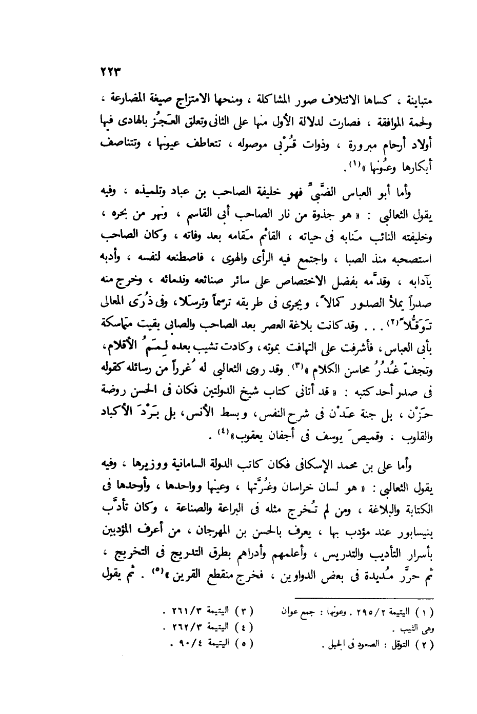وأما أبو العباس الضبي، فهو خليفة الصاحب بن عباد وتلميذه، وفيه يقول الثعالبي: "هو جذوة من نار الصاحب أبي القاسم، ونهر من بحره، وخليفته النائب منابه في حياته، القائم مقامه بعد وفاته، وكان الصاحب استصحبه منذ الصبا، واجتمع فيه الرأي والهوى، فاصطنعه لنفسه، وأدبه بآدابه، وقدمه بفضل الاختصاص على سائر صنائعه وندمائه، وخرج منه صدرًا يملأ الصدوركمالًا، ويجري في طريقه ترسمًا وترسلًا، وفي ذرى المعالي توقلًا2 ... وقد كانت بلاغة العصر بعد الصاحب، والصابي بقيت متماسكة بأبي العباس، فأشرفت على التهافت بموته، وكادت تشيب بعده لمم الأقلام، وتجف غدر محاسن الكلام3، وقد روى الثعالبي له غررًا من رسائله، كقوله في صدر أحد كتبه: "قد أتاني كتاب شيخ الدولتين، فكان في الحسن روضة حزن، بل جنة عدن في شرح النفس، وبسط الأنس، بل برد الأكباد والقلوب، وقميص يوسف في أجفان يعقوب"4.