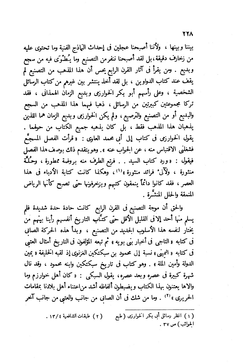 بيننا وبينها؛ ولأننا أصبحنا عجلين في إحداث النماذج الفنية، وما تحتوي عليه من زخارف دقيقة، بل لقد أصبحنا ننفر من التصنيع، وما يطوى فيه من سجع وبديع، ومن يقرأ في آثار القرن الرابع يحس أن هذا المذهب من التصنيع، لم يقف عند كتاب الدواوين، بل لقد أخذ ينتشر بين غيرهم من كتاب الرسائل الشخصية، وعلى رأسهم أبو بكر الخوارزمي، وبديع الزمان الهمذاني، فقد تركا مجموعتين كبيرتين من الرسائل، ذهبًا فيهما هذا المذهب من السجع، والبديع أو من التصنيع والترصيع، ولم يكن الخوارزمي، وبديع الزمان هما اللذين يذهبان هذا المذهب فقط، بل كان يذهبه جميع الكتاب من حولهما.