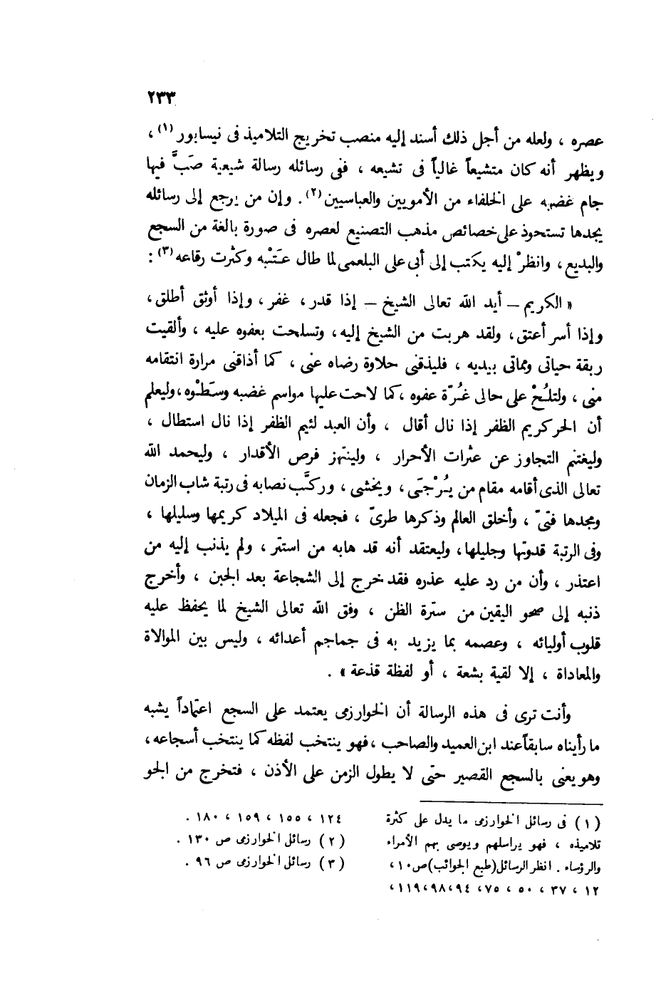 عصره، ولعله من أجل ذلك أسند إليه منصب تخريج التلاميذ في نيسابور1، ويظهر أنه كان متشيعًا غالبًا في تشيعه، ففي رسائله رسالة شيعية صب فيها جام غضبه على الخلفاء من الأمويين والعباسيين2، وإن من يرجع إلى رسائله يجدها تستحوذ على خصائص مذهب التصنيع لعصره في صورة بالغة من السجع، والبديع، وانظر إليه يكتب إلى أبي علي البلعمي لما طال عتبه، وكثرت رقاعه3: