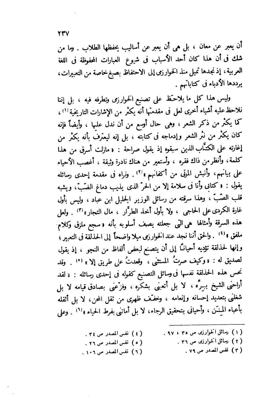 وليس هذا كل ما يلاحظ على تصنيع الخوارزمي، وتطرفه فيه، بل إننا نلاحظ عليه أشياء أخرى، لعل في مقدمتها أنه يكثر من الإشارات التاريخية1، كما يكثر من ذكر الشعر، وهي حال أوسع من أن ندل عليها، وأيضًا فإنه كان يكثر من نثر الشعر، وإدماجه في كتابته، بل إنه ليعترف بأنه يكثر من إغارته على الكتاب، الذين سبقوه إذ يقول صراحة: "ما زلت أسرق من هذا كلمة، وأنظر من ذاك فقره، وأستعير من هناك نادرة وثيقة، أغصب الأحياء على بيانهم، وأنبش الموتى من أكفانهم"2، ونراه في مقدمة إحدى رسائله يقول: "كتابي وأنا في سلامة إلا من الحر الذي يذيب دماغ الضب، ويشبه قلب الصب، وهذا سرقته، من رسائل الوزير الجليل ابن عباد، وليس بأول غارة الكردي على الحاجي، ولا بأول أخذ الطرار، ما التجار"3، ولعل هذه السرقة وأمثالها هي التي جعلته يصف أسلوبه بأنه "سجع ملزق، وكلام ملفق"4. والحق أننا نجد عند الخوارزمي ميلا واضحًا إلى الحذلقة في التعبير، وإنها لحذلقة تؤديه أحيانًا إلى أن تصنع لبعض ألفاظ من النجو، إذ يقول لصديق له: "وكيف صرت المستثنى، وقعدت على طريق إلا"5، وقد نحس هذه الحذلقة نفسها في رسائل التصنيع كقوله في إحدى رسائله: "لقد أراحني الشيخ ببره، لا بل أتعبني بشكره، وفزعني بصادق قيامه لا بل شغلني بتعديد إحسانه وإنعامه، وخفف ظهري من ثقل المحن، لا بل أثقله بأعباء المنن، وأحياني بحقيق الرجاء، لا بل أماتني بقرط الحياء"6، وعلى