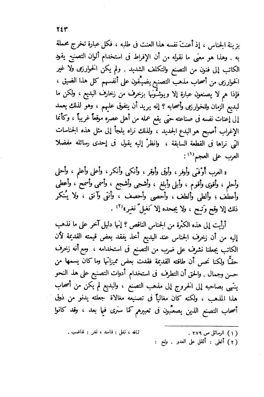 بزينة الجناس، إذ أعنت نفسه هذا العنت في طلبه، فكل عبارة تخرج محملة به، وهذا هو معنى ما نقوله من أن الإفراط في استخدام ألوان التصنيع، يقود الكاتب إلى فنون من التصنع، والتكلف الشديد، ولم يكن الخوارزمي، ولا غير الخوارزمي من أصحاب مذهب التصنيع، يضيقون على أنفسهم كل هذا الضيق، فإذا هم لا يصنعون عبارة، إلا ويوشونها بزخرف من زخارف البديع، ولكن ما لبديع الزمان، وللخوارزمي، وأصحابه؟ إنه يريد أن يتفوق عليهم، وهو لذلك يعمد إلى إعنات نفسه في صناعته، حتى يقع عمله من أهل عصره موقعًا غريبًا، وكأنما الإغراب أصبح هو البدع الجديد، ولذلك نراه يلجأ إلى مثل هذه الجناسات، التي نراها في القطعة السابقة، وانظر إليه يقول في إحدى رسائله مفضلًا العرب على العجم1: