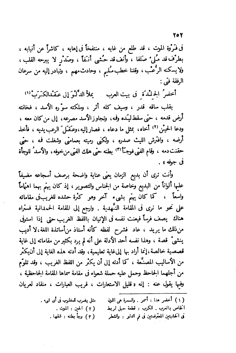 في فروة الموت، قد طلع من غابه، منتفخًا في إهابه، كاشرًا عن أنيابه، بطرف قد ملئ صلفا، وأنف قد حشي وصدر لا يبرحه القلب، ولا يسكنه الرعب، وقلنا: خطب مليم، وحادث مهم، وتبادر إليه من سرعان الرفقة فتى: