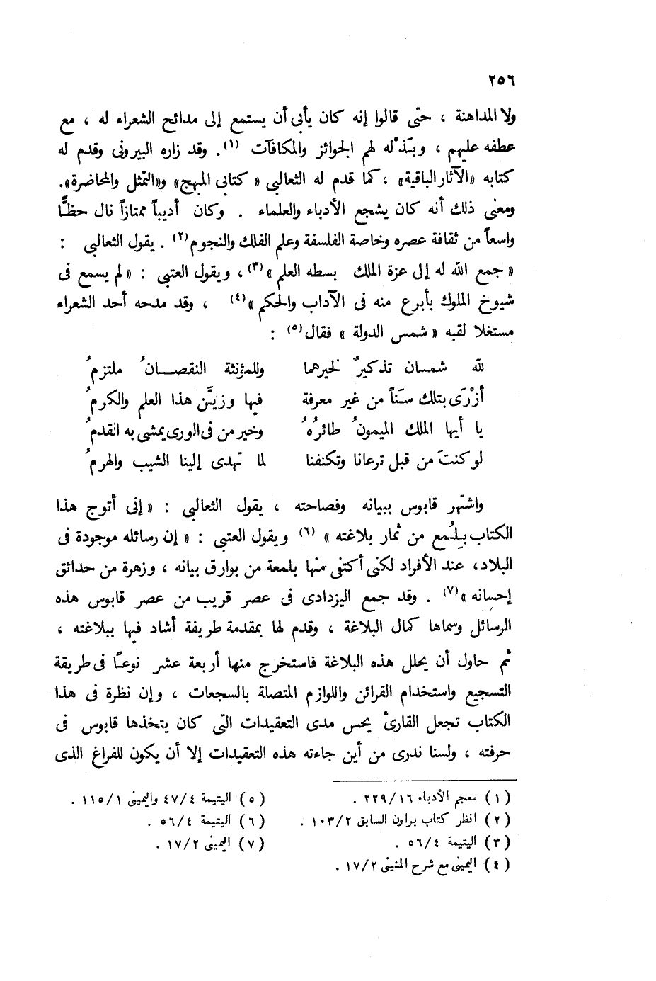 واشتهر قابوس ببيانه وفصاحته، يقول الثعالبي: "إني أتوج هذا الكتاب بلمع من ثمار بلاغته"6، ويقول العتبي: "إن رسائله موجودة في البلاد، عند الأفراد لكني أكتفي منها بلمعة من بوارق بيانه، وزهرة من حدائق إحسانه"7، وقد جمع اليزدادي في عصر قريب من عصر قابوس هذه الرسائل، وسماها كمال البلاغة، فاستخرج منها أربعة عشر نوعًا في طريقة التسجيع، واستخدام القرائن واللوازم المتصلة بالسجعات، وإن نظرة في هذا الكتاب تجعل القارش يحس مدى التعقيدات، التي كان يتخذها قابوس في حرفته، ولسنا ندري من أين جاءته هذه التعقيدات، إلا أن يكون للفراغ الذي