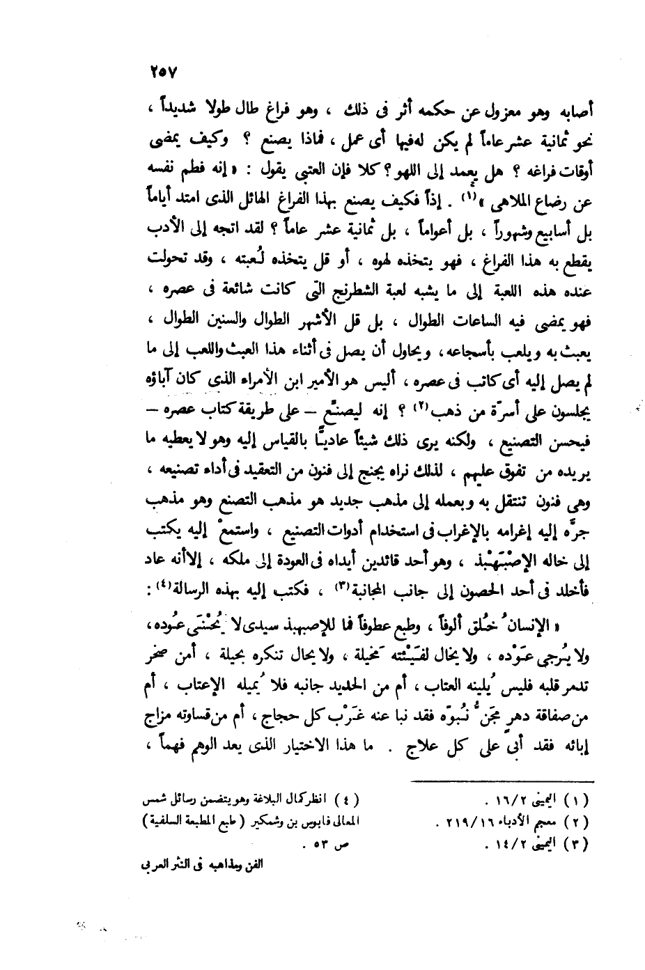 فهو يمضي فيه الساعات الطوال، بل قل: الأشهر الطوال والسنين الطوال، يعبث به ويلعب بأسجاعه، ويحاول أن يصل في أثناء هذا العبث، واللعب إلى ما لم يصل إليه أي كاتب في عصره، أليس هو الأمير ابن الأمراء الذي كان آرباوه يجلسون على أسرة من ذهب2؟ إنه ليصنع -على طريقة كتاب عصره- فيحسن التصنيع، ولكنه يرى ذلك شيئًا عاديًا بالقياس إليه، وهو لا يعطيه ما يريده من تفوق عليهم، لذك نراه يجنح إلى فنون من التعقيد في أداء تصنيعه، وهي فنون تنتقل به، وبعمله إلى مذهب جديد هو مذهب التصنع، وهو مذهب جره إليه إغرامه بالإغراب في استخدام أدوات التصنيع، واستمع إليه يكتب إلى خاله الإصبهبذ، وهو أحد قائدين أيداه في العودة إلى ملكه، إلا أنه عاد فأخلد في أحد الحصول إلى جانب المجانبة3، فكتب إليه بهذه الرسالة4: