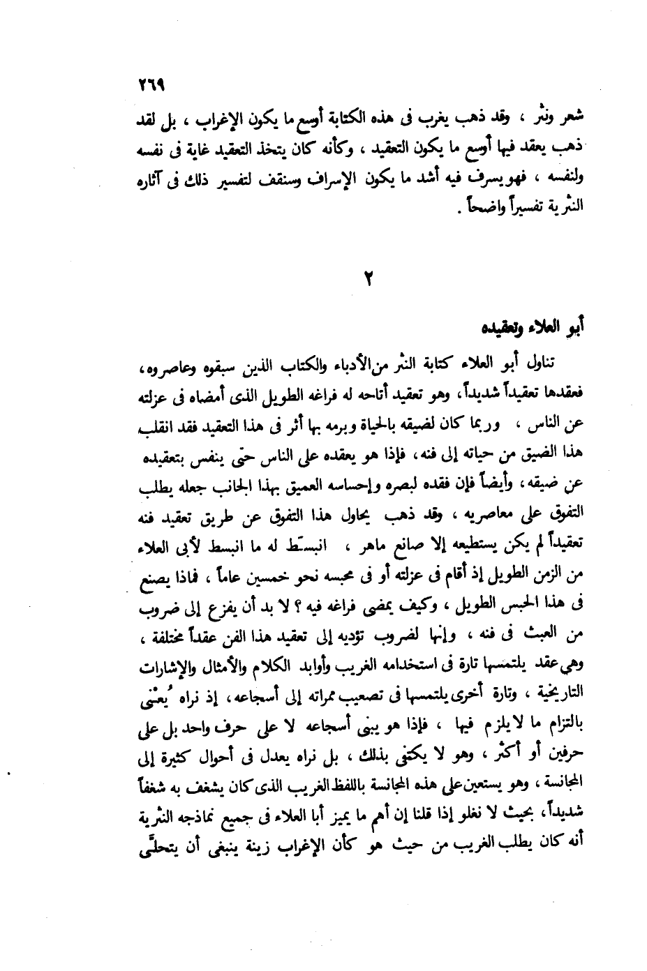 تناول أبو العلاء كتابة النثر من الأدباء، والكتب الذين سبقوه وعاصروه، فعقدها تعقيدًا شديدًا، وهو تعقيد أتاحه له فراغه الطويل، الذي أمضاه في عزلته عن الناس، وربما كان لضيقه بالحياة وبرمه بها أثر في هذا التعقيد، فقد انقلب هذا الضيق من حياته إلى فنه، فإذا هو يعقده على الناس، حتى ينفس بتعقيده عن ضيقه، وأيضًا فإن فقده لبصره، وإحساسه العميق بهذا الجانب جعله يطلب التفوق على معاصريه، وقد ذهب يحاول هذا التفوف عن طريق تعقيد فنه تعقيدًا لم يكن يستطيعه إلا صانع ماهر، انبسط له ما انبسط لأبي العلاء من الزمن الطويل، إذ أقام في عزلته أو في محسبه نحو خمسين عامًا، فماذ يصنع في هذا الحبس الطويل، وكيف يمضي فراغه فيه؟ لا بد أن يفزع إلى ضروب من العبث في فنه، وإنها لضروب تؤديه إلى تعقيد هذا الفن عقدًا مختلفة، وهي عقد يلتمسها تارة في استخدامه الغريب، وأوابد الكلام والأمثال، والإشارات التاريخية، وتارة أخرى يلتمسها في تصعيب ممراته إلى أسجاعه، إذ نراه يعنى بالتزام ما لا يلزم فيها، فإذا هو يبني أسجاعه لا على حرف واحد، بل على حرفين أو أكثر، وهو لا يكتفي بذلك، بل نراه يعدل في أحوال كثيرة إلى المجانسة، وهو يستعين على هذه المجانسة باللفظ الغريب، الذي كان يشغف به شغفًا شديدًا، بحيث لا نغلو إذا قلنا: إن أهم ما يميز أبا العلاء في جميع نماذجه النثرية، أنه كان يطلب الغريب من حيث هو، كأن الإعراب زينة ينبغي أن يتحلى