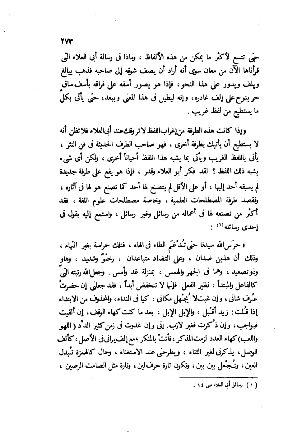 وإذا كانت هذه الطرفة من إغراب اللفظ لا تروقك عند أبي العلاء، فلا تظن أنه لا يستطيع أن يأتيك بطرفة أخرى، فهو صاحب الطرف الحديثة في فن النثر، يأتي باللفظ الغريب، ويأتي بما يشبه هذا اللفظ أحيانًا أخرى، لكن أي شيء يشبه ذلك اللفظ؟ لقد فكر أبو العلاء وقدر، فإذا هو يقع على طرفة جديدة لم يسبقه أحد إليها، أو على الأقل لم يتصنع لها أحد، كما تصنع هو لها في آثاره، ونقصد طرفة المصطلحات العلمية، وخاصة مصطلحات علوم اللغة، فقد أكثر من تصنعه لها في أعماله من رسائل وغير رسائل، واسمتع إليه يقول في إحدى رسائله1: