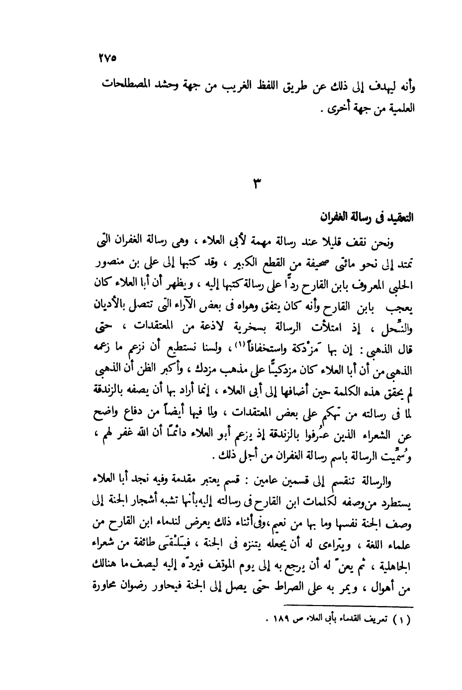 ونحن نقف قليلًا عند رسالة مهمة لأبي العلاء، وهي رسالة الغفران التي تمتد إلى نحو مائتي صحيفة من القطع الكبير، وقد كتبها إلى علي بن منصور الحلبي المعروف بابن القارح ردًا على رسالة كتبها إليه، ويظهر أن أبا العلاء كان يعجب بابن القارح، وأنه كان ينفق وهواه في بعض الآراء، التي تتصل بالأديان والنحل، إذ امتلأت الرسالة بسخرية لاذعة من المعتقدات، حتى قال الذهبي: إن بها مزدكة واستخفافًا1، ولسنا نستطيع أن نزعم ما زعمه الذهبي من أن أبا العلاء كان مزدكيًا على مذهب مزدك، وأكبر الظن أن الذهبي لم يحقق هذه الكلمة حين أضافها إلى أبي العلاء، إنما أراد بها أن يصفه بالزندقة لما في رسالته من تهكم على بعض المعتقدات، ولما فيها أيضًا من دفاع واضح عن الشعراء الذين عرفوا بالزندقة، إذ يزعم أبو العلاء دائمًا أن الله غفر لهم، وسميت الرسالة باسم رسالة الغفران من أجل ذلك.