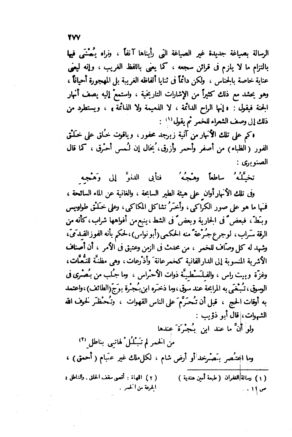 الرسالة بصياغة جديدة غير الصياغة التي رأيناها آنفًا، ونراه يعني فيها بالتزام ما لا يلزم في قرائن سجعه، كما يعني اللفظ الغريب، وإنه ليعني عناية خاصة بالجناس، ولكن دائمًا في ثنايا ألفاظه الغريبة، بل المهجورة أحيانًا، وهو يحشد مع ذلك كثيرًا من الإشارات التاريخية، واستمع إليه يصف أنهار الجنة، فيقول: "إنها الراح الدائمة، لا الذميمة ولا الذائمة"، ويستطرد من ذلك إلى وصف الشعراء للخمر، ثم يقول1:
