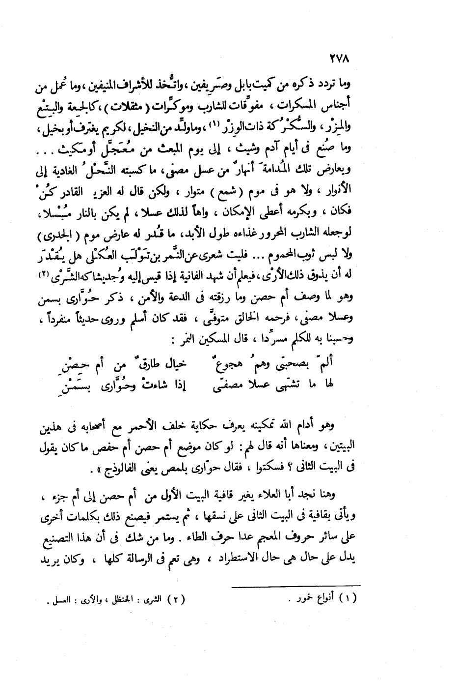 ويعارض تلك المدامة أنهار من عسل مصفى، ما كسبته النحل الغادية إلى الأنوار، ولا هو في موم "شمع" متوار، ولكن قال له العزيز القادر كن فكان، وبكرمه أعطى الإمكان، واهًا لذلك عسلًا لم يكن بالنار مبسلًا، لو جعله الشارب المحرور غذاءه طول الأبد، ما قدر له عارض موم "الجدري" ولا لبس ثوب المحموم ... فليت شعري عن النمر بن تولب العكلي، هو يقدر له أن يذوق ذلك الأري، فيعلم أن شهد الفانية إذا قيس إليه وجد يشاكه الشرى2، وهو لما وصف أم حصن، وما رزقته في الدعة والمن، ذكر حواري بسمن وعسلًا مصفى، فرحمه الخالق متوفى، فقد كان أسلم وروى حديثًا منفردًا، وحسبنا بن للكلم مسردًا، قال المسكين النمر: