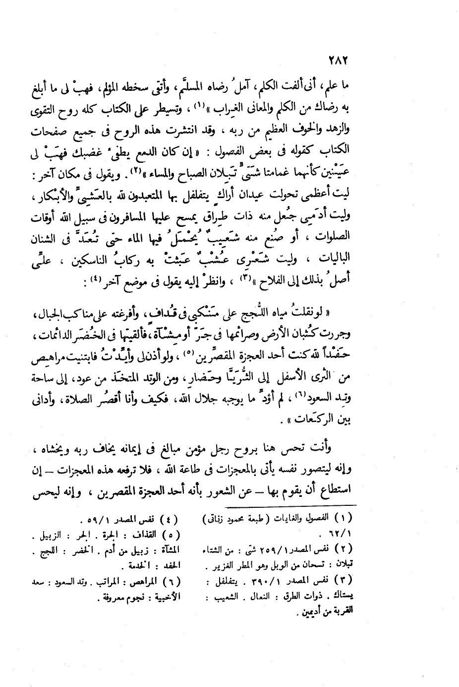 ما علم، أني ألفت الكم، آمل رضا المسلم، وأتقي سخطه المؤلم، فهب لي ما أبلغ به رضاك من الكلم والمعاني الغراب"1، وتسيطر على الكتاب كله روح التقوى، والزهد، والخوف العظيم من ربه، وقد انتشرت هذه الروح في جميع صفحات الكتاب، كقوله في بعض الفصول: "إن كان الدمع يطفئ غضبك فهب لي عينين، كأنهما غمامتا شتى تبلان الصباح والمساء"2، ويقول في مكان آخر: ليت أعظمي تحولت عيدان أراك يتفلفل بها المتعبدون لله بالعشي، والأبكار، وليت أدمي جعل منه ذات طراق يمسح عليها المسافرون في سبيل الله أوقات الصلوات، أو صنع منه شعيب يحمل فيها الماء، حتى تعد في الشنان الباليات، وليت شعري عشب عبث به ركاب الناسكين، على أصل بذلك إلى الفلاح3، وانظر إليه يقول في موضوع آخر4: