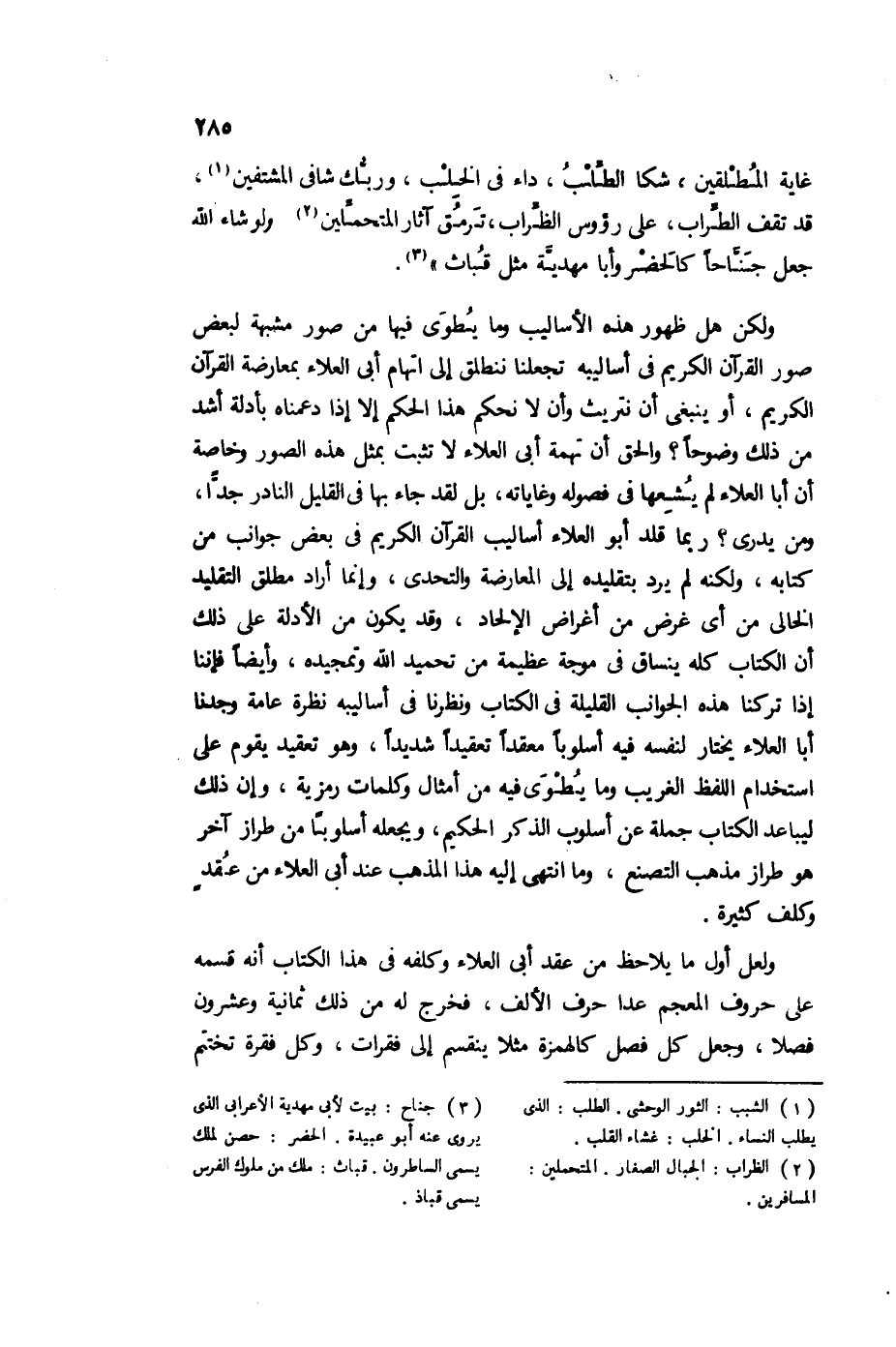 ولكن هل ظهور هذه الأساليب، وما يطوي فيها من صور مشبهة لعبض صورة القرآن الكريم في أساليبه، تجعلنا ننطلق إلى اتهام أبي العلاء بمعارضة القرآن الكريم، أو ينبغي أن نتريث وأن لا نحكم هذا الحكم إلا إذا دعمناه بأدلة أشد من ذلك وضوحًا؟ والحق أن تهمة أبي العلاء لا تثبت بمثل هذه الصورة، وخاصة أن أبا العلاء لم يشعها في فصوله وغاياته، بل لقد جاء بها في القليل النادر جدًا، ومن يدري؟ ربما قلد أبو العلاء أساليب القرآن الكريم في بعض جوانب من كتابه، ولكنه لم يرد تقليده إلى المعارضة والتحدي، وإنما أراد مطلق التقليد الخالي من أي غرض من أغراض الإلحاد، وقد يكون من الأدلة على ذلك أن الكتاب كله ينساق في موجة عظيمة من تحميد الله وتمجيده، وأيضا فإننا إذا تركنا هذه الجوانب القليلة في الكتاب، ونظرنا في أساليبه نظرة عامة، وجدنا أبا العلاء يختار لنفسه فيه أسلوبًا معقدًا تعقيدًا شديدًا، وهو تعقيد يقوم على استخدام اللفظ الغريب، وما يطوي فيه من أمثال، وكلمات رمزية، وإن ذلك ليباعد الكتاب جملة عن أسلوب الذكر الحكيم، ويجعله أسلوبا من طراز آخر هو طراز مذهب التصنع، وما انتهى إليه هذا المذهب عند أبي العلاء من عقد، وكلف كثيرة.