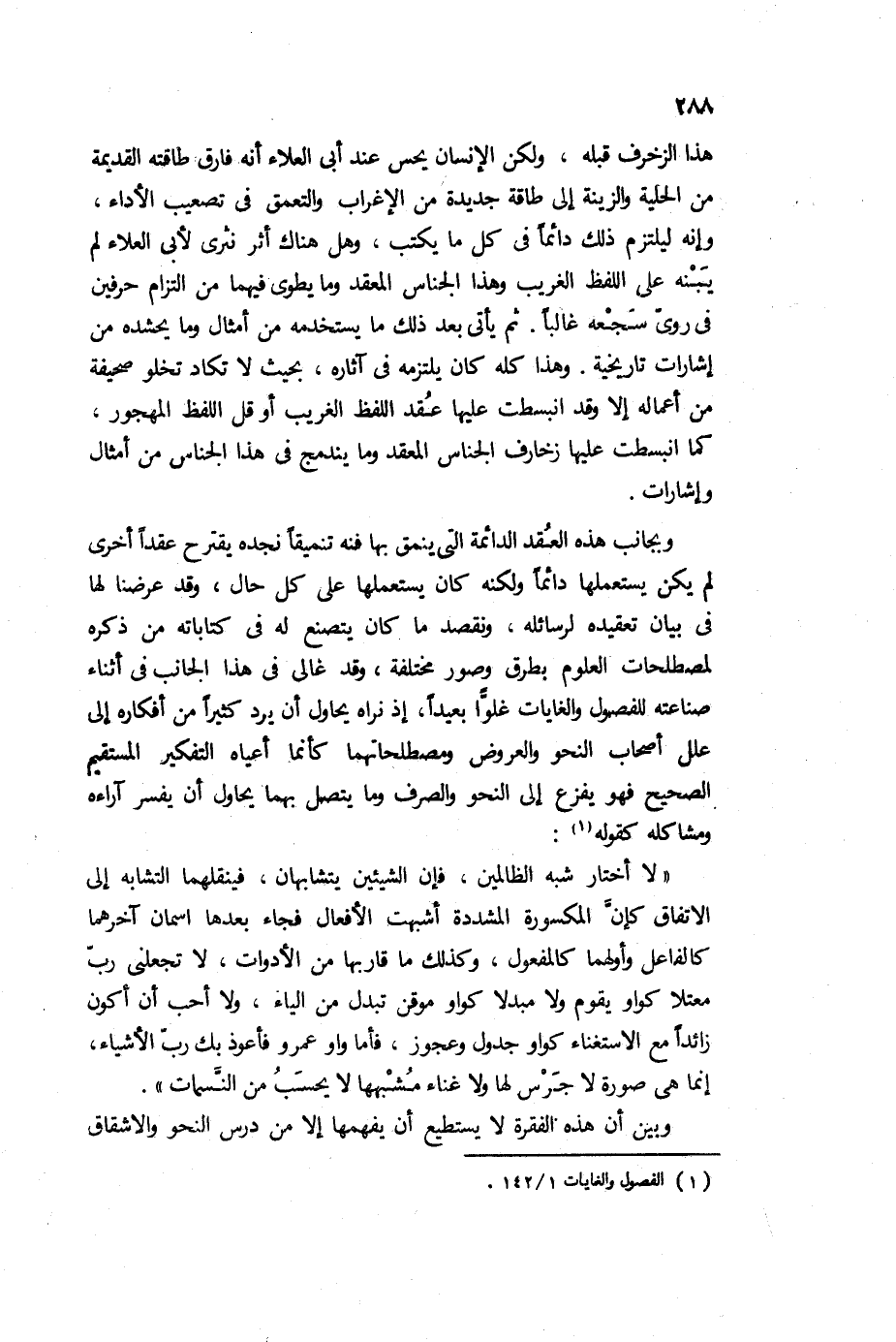 وبجانب هذه العقد الدائمة التي ينمق بها فنه تنميقًا نجده يقترح عقدًا أخرى لم يكن يستعملها دائمًا، ولكنه كان يستعملها على كل حال، وقد عرضنا لها في بيان تعقيده لرسائله، ونقصد ما كان يتصنع له في كتاباته من ذكره لمصطلحات العلوم بطرق وصور مختلفة، وقد غالى في هذا الجانب في أثناء صناعته للفصول والغايات غلوًا بعيدًا، إذ نراه يحاول أن يرد كثيرًا من أفكاره إلى علل أصحاب النحو والعروض ومصطلحاتهما، كأنما أعياه التفكير المستقيم الصحيح، فهو يفزع إلى النحو والصرف، وما يتصل بهما يحاول أن يفسر آراءه، ومشاكله كقوله1:
