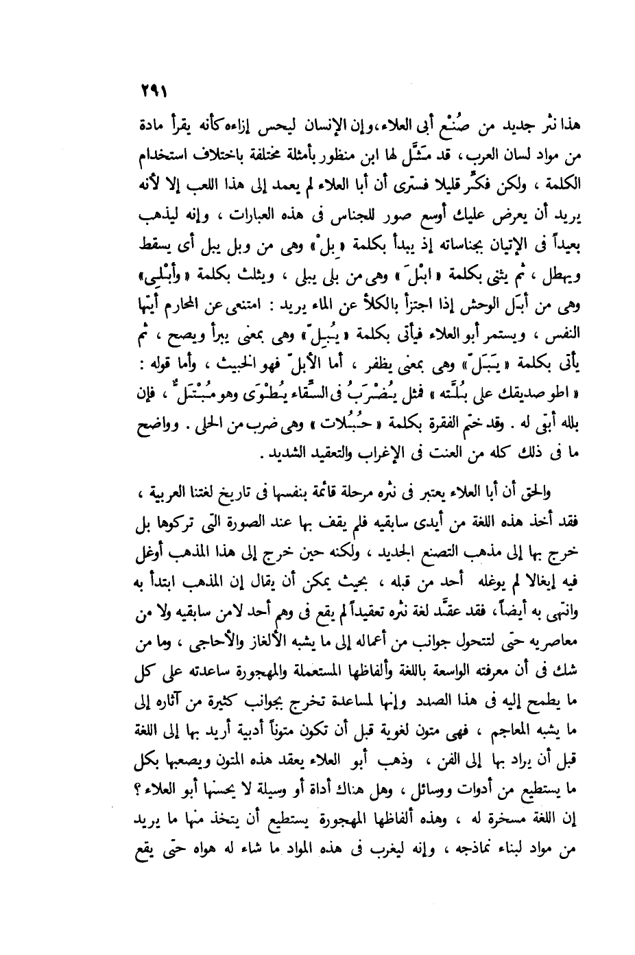 هذا نثر جديد من صنع أبي العلاء، وإن الإنسان ليحس إزاءه، كأنه يقرأ مادة من مواد لسان العرب، قد مثل لها ابن منظور بأمثلة مختلفة باختلاف استخدام الكلمة، ولكن فكر قليلًا فسترى أن أبا العلاء لم يعمد إلى هذا اللعب إلا؛ لأنه يريد أن يعرض عليك أوسع صور للجناس في هذه العبارات، وإنه ليذهب بعيدًا في الإتيان بجناساته، إذ يبدأ بكلمة "بل"، وهي من وبل يبل أي يسقط ويهطل، ثم يثني بكلمة "ابل"، وهي بلي يبلى، ويثلث بكلمة "وأبلى"، وهي من أبل الوحش إذ اجتزأ بالكلأ عن الماء يريد: "امتنعي عن المحارم أيتها النفس، ويستمر أبو العلاء، فيأتي بكلمة "يبل"، وهي بمعنى يبرأ ويصح، ثم يأتي بكلمة "يبل"، وهي يظفر، أما الأبل فهو الخبيث، وأما قوله:
