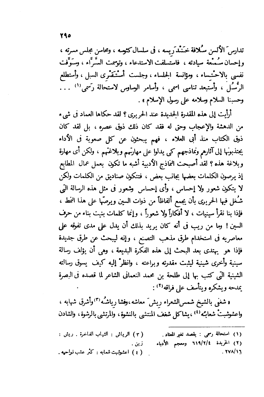 أرأيت إلى هذه المقدرة الجديدة عند الحريري؟ لقد حكاها العماد في شيء من الدهشة، والإعجاب وحق له فقد كان ذلك ذوق عصره، بل لقد كان ذوق الكتاب منذ أبي العلاء، فهم يبحثون عن كل صعوبة في الأداء يجتذبونها إلى آثارهم، ونماذجهم كي يدلوا على مهارتهم وبلاغتهم، ولكن أي مهارة، وبلاغة هذه؟ لقد أصبحت النماذج الأدبية أشبه ما تكون بعمل عمال المطابع، إذ يرصون الكلمات بعضها بجانب بعض، فتتكون صناديق من الكلمات، ولكن لا يتكون شعور ولا إحساس، وأي إحساس وشعور في مثل هذه الرسالة، التي شغل فيها الحريري بأن يجمع ألفاظًا من ذوات السين، ويرصها على هذا النمط، فإذا بنا نقرأ سينيات، لا أفكارًا ولا شعورًا، وإنما كلمات بنيت بناء من حرف السين! وما من ريب في أنه كان يريد بذلك، أن يدل على مدى تفوقه على معاصريه في استخدام طرق مذهب التصنعه، وإنه ليبحث عن طرق جديدة، فإذا هو يهتدي بعد البحث إلى هذه الفكرة البديعة، وهي أن يؤلف رسالة سينية، وأخرى شينية ليثبت مقدرته وبراعته، وانظر إليه كيف يسوق رسالته الشينية، التي كتب بها إلى طلحة بن محمد النعماني الشاعر لما قصده في البصرة يمدحه، ويشكره، ويتأسف على فراقه2: