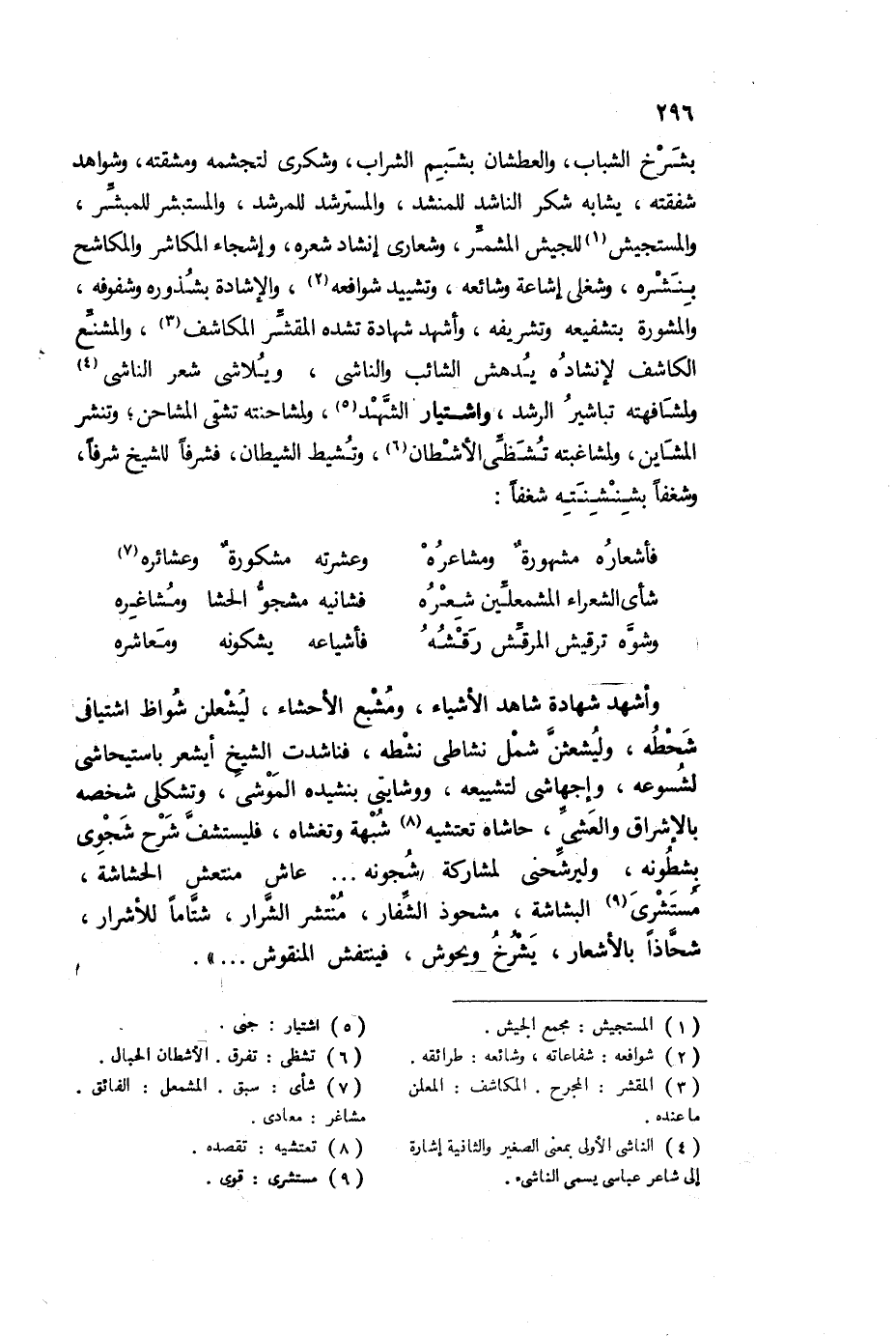 وأشهد شهادة شاهد الأشياء، ومشبع الأحشاء، ليشعلن شواظ اشتياقي شحطه، وليشعثن شمل نشاطي نشطه، فناشدت الشيخ أيشعر باستيحاشي لشسوعه، واجهاشي لتشييعه، ووشتايتي بنشيده الموشي، وتشكلي شخصه بالإشراق والعشي، حاشاه تعتشيه8 شبهة وتغشاه، فليستشف شرح شجوي بشطيرنه، وليرشحني لمشاركة شجونه ... عاش منتعش الحشاشة، مستشري9 البشاشة، مشحوذ الشفار، منتشر الشرار، شتامًا للأشرار، شحاذًا بالأشعار، يشرخ ويحوش، فينتفش المنقوش ... "