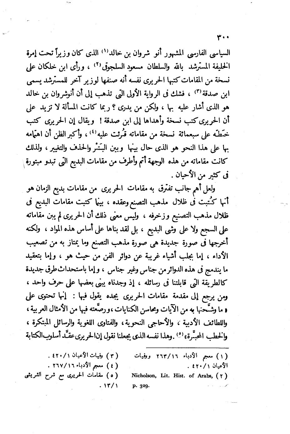 السياسي الفارسي المشهور أنو شروان بن خالد1، الذي كان وزيرًا تحت إمرة الخليفة المسترشد بالله، والسلطان مسعود السلجوقي2، ورأى ابن خلكان على نسخة من المقامات، كتبها الحريري نفسه أنه صنفها لوزير آخر للمسترشد يسمى ابن صدقة3، فشك في الرواية الأولى، التي تذهب إلى أن أنوشروان بن خالد هو الذي أشار عليه بها، ولكن من يدري؟ ربما كانت المسألة لا تزيد على أن الحريري كتب نسخة، وأهداها إلى ابن صدقة! ويقال: إن الحريري كتب خطه على سبعمائة نسخة من مقاماته قرئت عليه4، وأكبر الظن أن اهتمامه بها على هذا النحو، هو الذي حال بينها وبين البتر والحذف، والتغيير، ولذلك كانت مقاماته من هذه الوجهة، أتم وأطرف من مقامات البديع التي تبدو مبتورة في كثيرة من الأحيان.