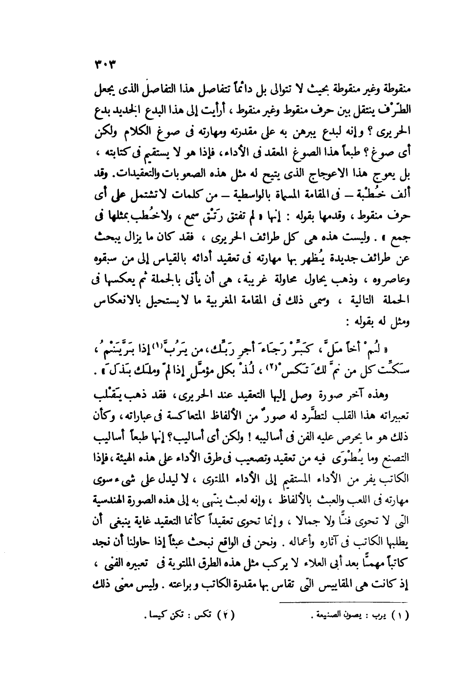 وهذه آخر صورة، وصل إليها التعقيد عند الحريري، فقد ذهب يقلب تعبيراته هذا القلب لتطرد له صورة من الألفاظ المتعاكسة في عباراته، وكأن ذلك هو ما يحرص عليه الفن في أساليبه! ولكن أي أساليب؟ أنها طبعًا أساليب التصنع، وما يطوى فيه من تعقيد، وتصعيب في طرق الأداء على هذه الهيئة، فإذا الكاتب يفر من الأداء المستقيم إلى الأداء الملتوي، لا ليدل على شيء سوى مهارته في اللعب والعبث بالألفاظ، وأنه لعبث ينتهي به إلى هذه الصورة الهندسية، التي لا تحوي فنا ولا جمالًا، وإنما تحوي تعقيدًا، كأنما التعقيد غاية ينبغي أن يطلبها الكاتب في آثاره وأعماله، ونحن في الواقع نبحث عبثًا إذا حاولنا أن نجد كاتبًا مهمًا بعد أبي العلاء، لا يركب مثل هذه الطرق الملتوية في تعبيره الفني، إذ كانت هي المقاييس التي تقاس بها مقدرة الكاتب وبراعته، وليس معنى ذلك