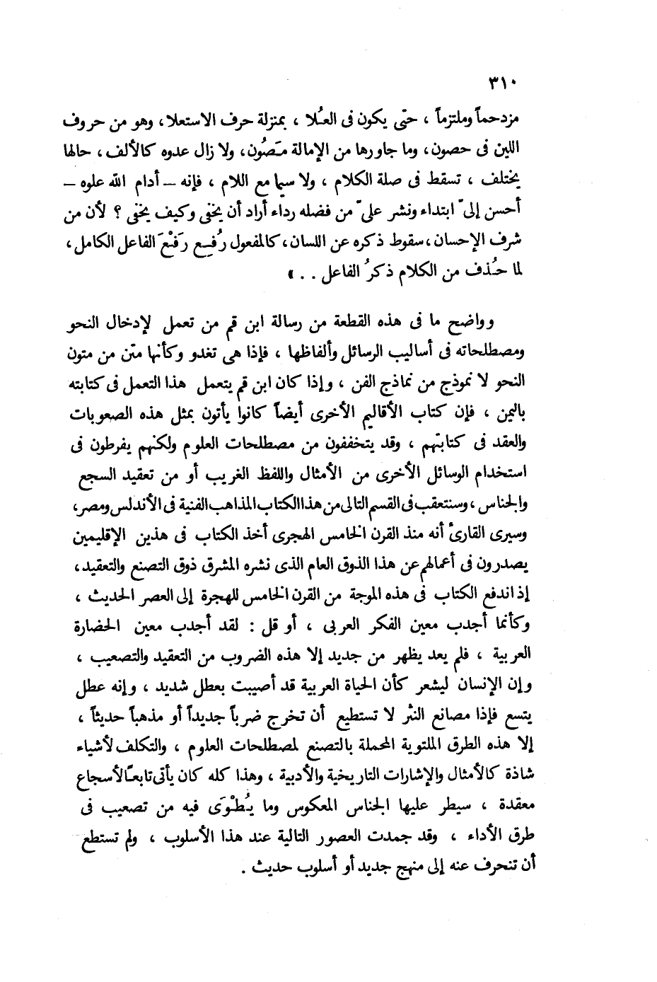 وواضح ما في هذه القطعة من رسالة ابن قم من تعمل لإدخال النحو ومصطلحاته في أساليب الرسائل وألفاظها، فإذا هي تغدو، وكأنها متن من متون النحو لا نموذج من نماذج الفن، وإذا كان ابن قم يتعمل هذا التعمل في كتابته باليمن، فإن كتاب الأقاليم الأخري أيضًا، كانوا يأتون بمثل هذه الصعوبات، والعقد في كتابتهم، وقد يتخففون من مصطلحات العلوم، ولكنهم يفرطون في استحدام الوسائل الأخرى من الأمثال واللفظ الغريب، أو من تعقيد السجع والجناس، وسنتعقب في القسم التالي من هذا الكتاب المذاهب الفنية في الأندلس، ومصر، وسيرى القارئ أنه منذ القرن الخامس الهجري، أخذ الكتاب في هذين الإقليمين يصدرون في أعمالهم عن هذا الذوق العام، الذي نشره المشرق ذوق التصنع والتعقيد، إذا اندفع الكتاب في هذه الموجة من القرن الخامس للهجرة إلى العصر الحديث، وكأنما أجدب معين الفكر العربي، أو قل: لقد أجدب معين الحضارة العربية، فلم يعد يظهر من جديد إلا هذه الضروب من التعقيد والتصعيب، وإن الإ نسان ليشعر كأن الحياة العربية، قد أصيبت بعطل شديد، وإنه عطل يتسع فإذا مصانع النثر لا تستطيع أن تخرد ضربًا جديدًا أو مذهبا حديثًا، إلا هذه الطرق الملتوية المحملة بالتصنع لمصطلحات العلوم، والتكلف لأشياء شاذة كالأمثال، والإشارات التاريخية والأدبية، وهذا كله كان يأتي تابعًا لأسجاع معقدة، سيطر عليها الجناس المعكوس، وما يطوى فيه من تصعيب في طرق الأداء، وقد جمدت العصور التالية عند هذا الأسلوب، ولم تستطع أن تنحرف عنه إلى منهج جديد، أو أسلوب حديث.