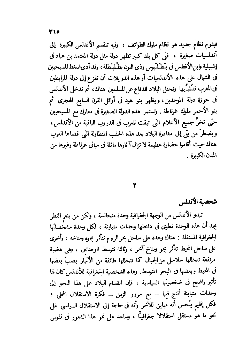 فيقوم نظام جديد هو نظام ملوك الطوائف، وفيه تنقسم الأندلس الكبيرة إلى أندلسيات صغيرة، ففي كل بلد كبير تظهر دولة مثل دولة المعتمد بن عباد في إشبيلية، وابن الأفطس في بطليوس، وذي النون بطليطلة، وقد أدى ضغط المسيحيين في الشمال على هذه الأندلسيات، أو هذه الدويلات أن تفزع إلى دولة المرابطين في المغرب، فتلبيها وتحتل البلاد للدفاع عن المسلمين هناك، ثم تدخل الأندلس في حوزة دول الموحدين، ويظهر بنو هود في أوائل القرن السابع الهجري، ثم بنو الأحمر ملوك غرناطة، وتستمر هذه الدولة الصغيرة في معارك مع المسيحيين، حتى تخر جميع الأعلام التي تبقت للعرب في الدروب الباقية من الأندلس، ويضطر من بقي إلى مغادرة البلاد بعد هذه الحقب المتطاولة، التي قضاها العرب هناك، حيث أقاموا حضارة عظيمة لا تزال آثارها في مباني غرناطة، وغيرها من المدن الكبيرة.