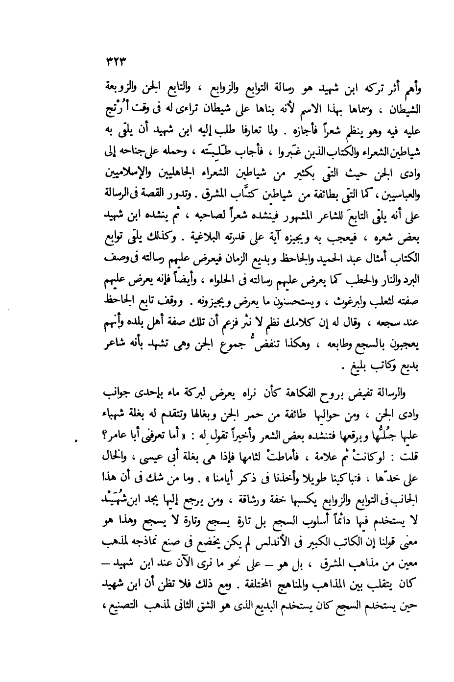 قلت: لو كانت ثم علامة، فأماطت لثامها فإذا هي بغلة أبي عيسى، والخال على خدها، فتباكينا طويلًا، وأخذنا في ذكر أيامنا". وما من شك في أن هذا الجانب في التوابع والزوابع يكسبها خفة ورشاقة، ومن يرجع إليه يجد ابن شهيد لا يستخدم فيها دائمًا أسلوب السجع، بل تارة يسجع وتارة لا يسجع، وهذا هو معنى قولنا: إن الكاتب الكبير في الأندلس، لم يكن يخضع في صنع نماذجه لمذهب معين من مذاهب المشرق، بل هو -على نحو ما نرى الآن عند ابن شهيد- كان يتقلب بين المذاهب والمناهج المختلفة، ومع ذلك فلا تظن أن ابن شهيد حين يستخدم السجع كان يستخدم البديع، الذي هو الشق الثاني لمذهب التصنيع،