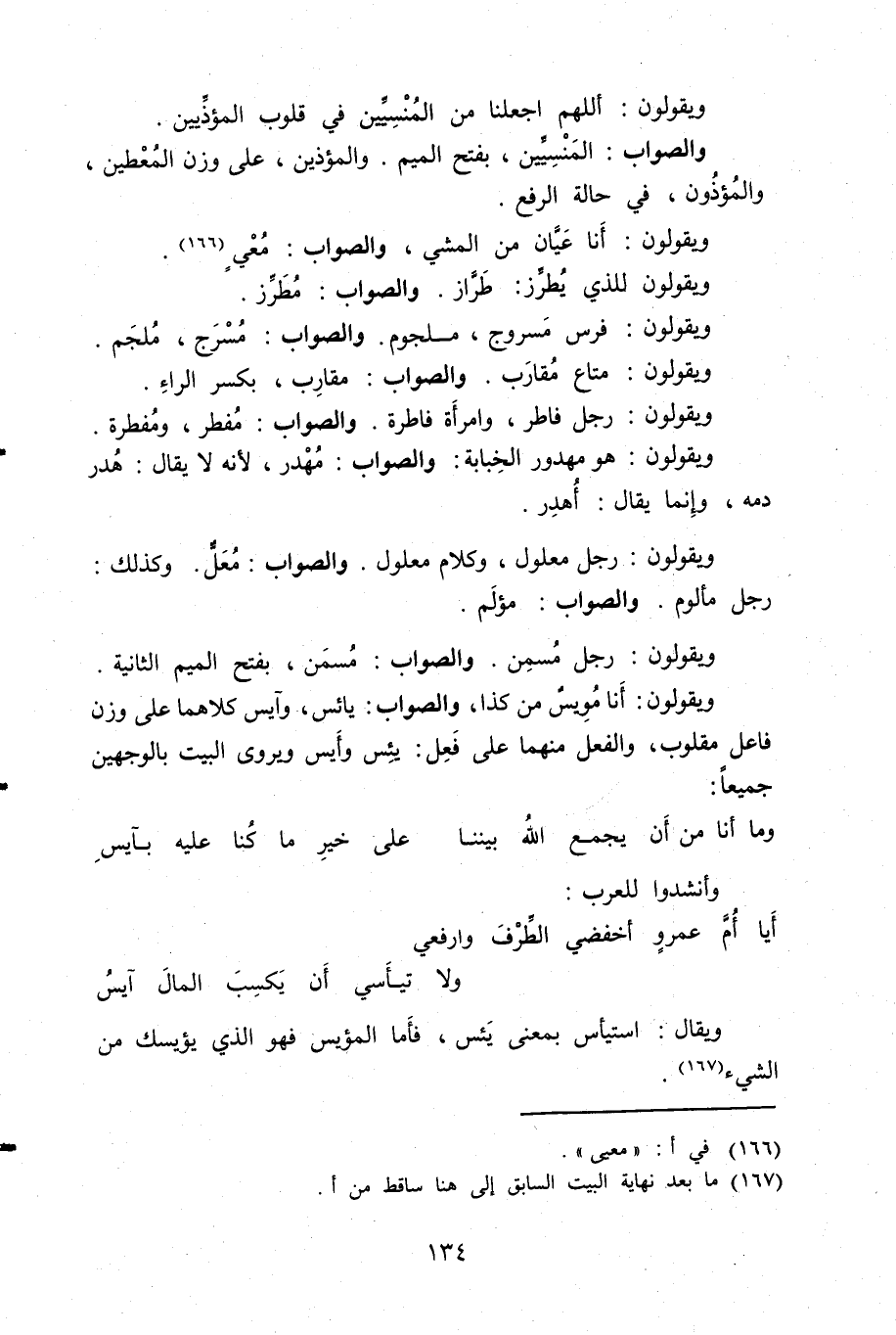 ويقولون: رجل مسمن. والصواب: مسمن، بفتح الميم الثانية. ويقولون: أنا مويس من كذا، والصواب: يائس، وآيس كلاهما على وزن فاعل مقلوب، والفعل منهما على فعل: يئس وأيس ويروى البيت بالوجهين جميعا: