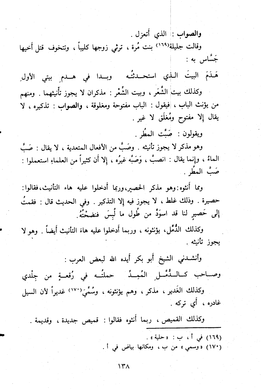 وكذلك بيت الشعر، وبيت الشعر: مذكران لا يجوز تأنيثهما. ومنهم من يؤنث الباب، فيقول: الباب مفتوحة ومغلوقة، والصواب: تذكيره، لا يقال إلا مفتوح ومغلق لا غير.