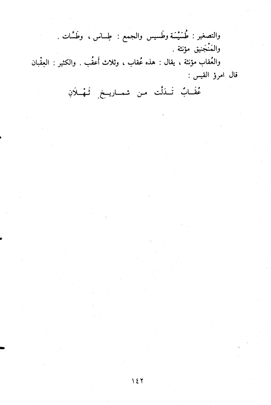 والتصغير: طسيسة وطسيس والجمع: طساس، وطسات.