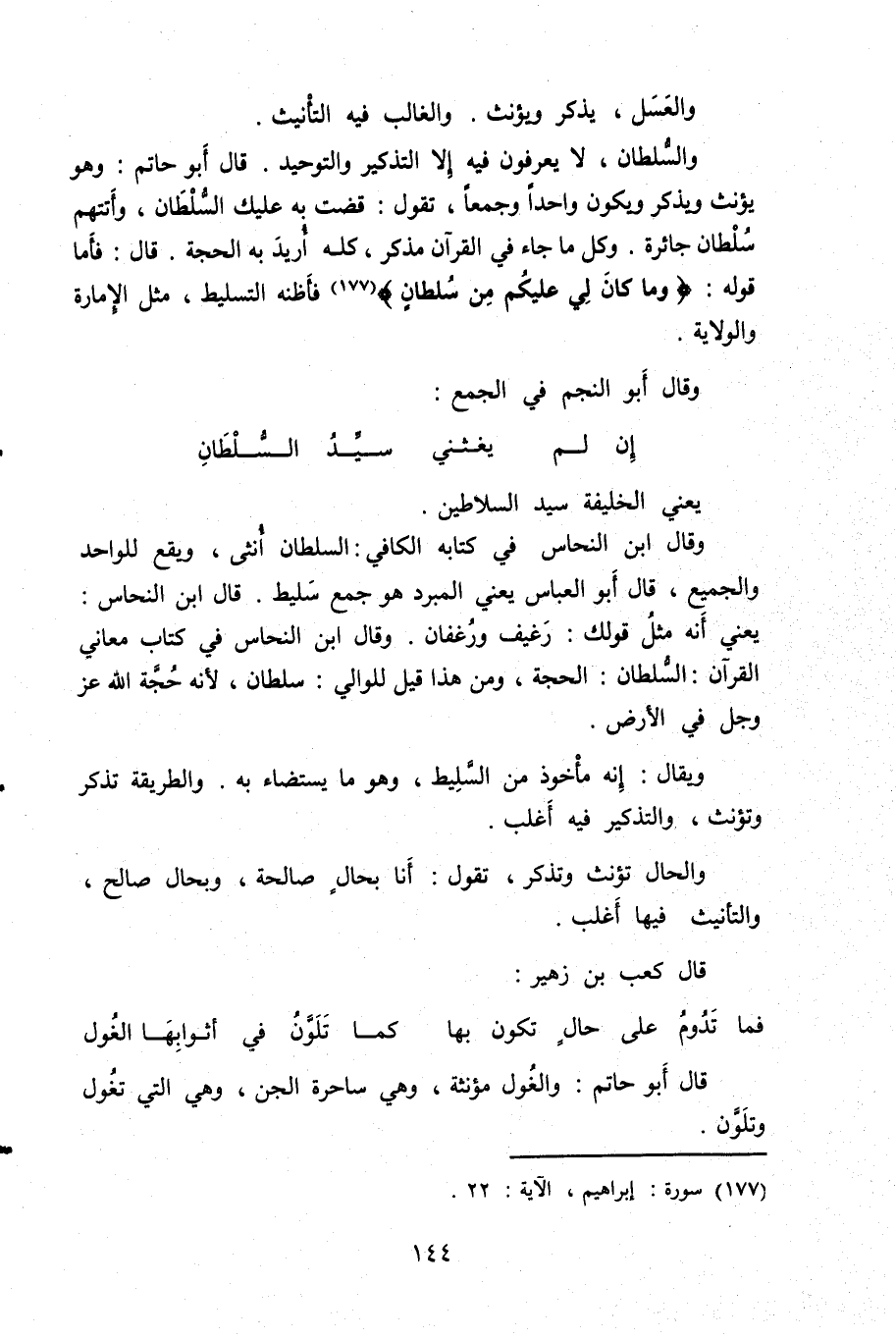 والسلطان، لا يعرفون فيه إلا التذكير والتوحيد. قال أبو حاتم: وهو يؤنث ويذكر ويكون واحدا وجمعا، تقول: قضت به عليك السلطان، وأتتهم سلطان جائرة، وكل ما جاء في القرآن مذكر، كله أريد به الحجة، قال: فأما قوله: {وما كان لي عليكم من سلطان} فأظنه التسليط، مثل الإمارة الولاية.