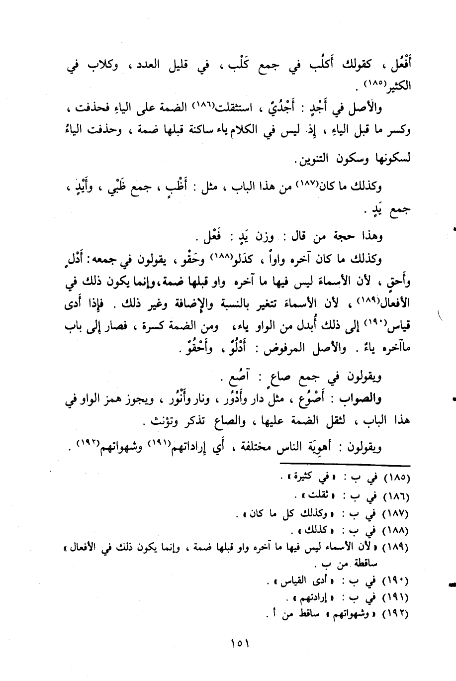 وكذلك ما كان آخره واوا، كدلو وحقو، يقولون في جمعه: أدل وأحق، لأن الأسماء ليس فيها ما آخره واو قبلها ضمة، وإنما يكون ذلك في الأفعال، لأن الأسماء تتغير بالنسبة والإضافة وغير ذلك. فإذا أدى قياس إلى ذلك أبدل من الواو ياء، ومن الضمة كسرة، فصار إلى باب ما آخره ياء. والأصل المرفوض: أدلو، وأحقو.
