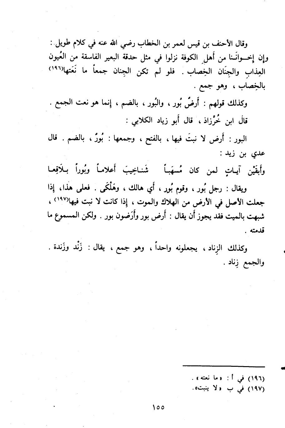 وقال الأحنف بن قيس لعمر بن الخطاب رضي الله عنه في كلام طويل: وإن إخواننا من أهل الكوفة نزلوا في مثل حدقة البعير الفاسقة من العيون العذاب والجنان الخصاب. فلو لم تكن الجنان جمعا ما نعتها بالخصاب، وهو جمع.