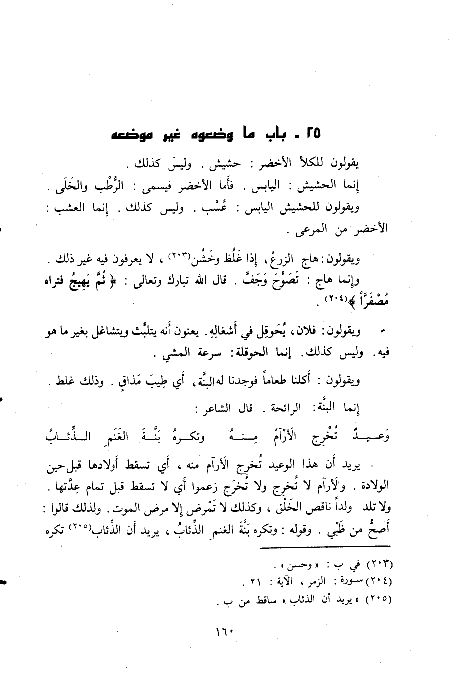 ويقولون: هاج الزرع، إذا غلظ وخشن، لا يعرفون فيه غير ذلك. وإنما هاج: تصوح وجف، قال الله تبارك وتعالى: {ثم يهيج فتراه مصفرا}.