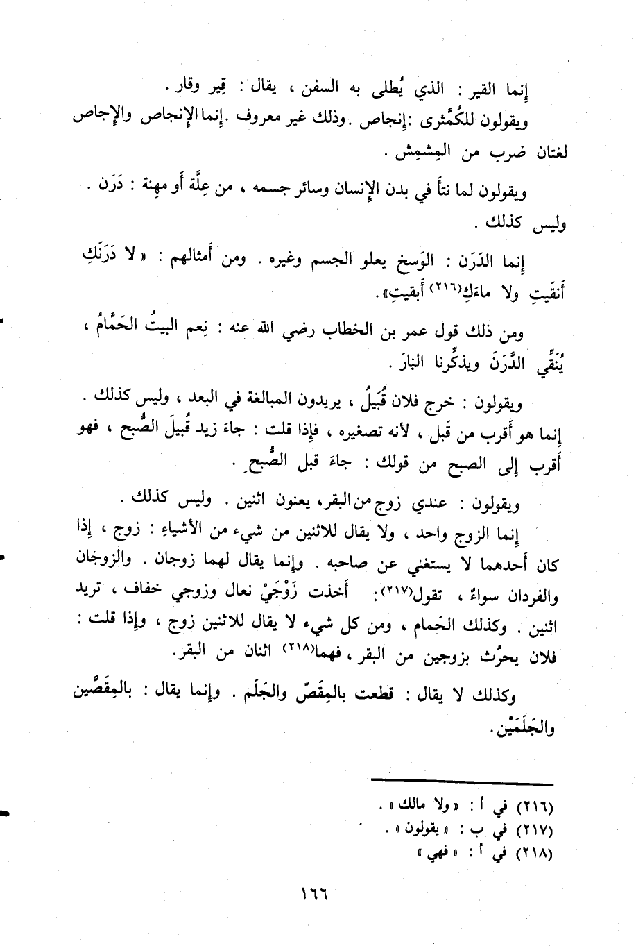 إنما الزوج واحد، ولا يقال للاثنين من شيء من الأشياء: زوج، إذا كان أحدهما لا يستغني عن صاحبه. وإنما يقال لهما زوجان. والزوجان والفردان سواء، تقول: أخذت زوجي نعال وزوجي خفاف، تريد اثنين. وكذلك الحمام، ومن كل شيء لا يقال للاثنين زوج، وإذا قلت: فلان يحرث بزوجين من البقر، فهما اثنان من البقر.