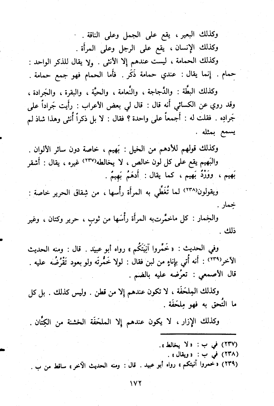 وكذلك البطة: والدجاجة. والنعامة، والحية، والبقرة، والجرادة، وقد روى عن الكسائي أنه قال: قال لي بعض الأعراب: رأيت جرادًا على جراده. فقلت له: أجمعا على واحدة؟ فقال: لا بل ذكرا أنثى وهذا شاذ لم يسمع بمثله.
