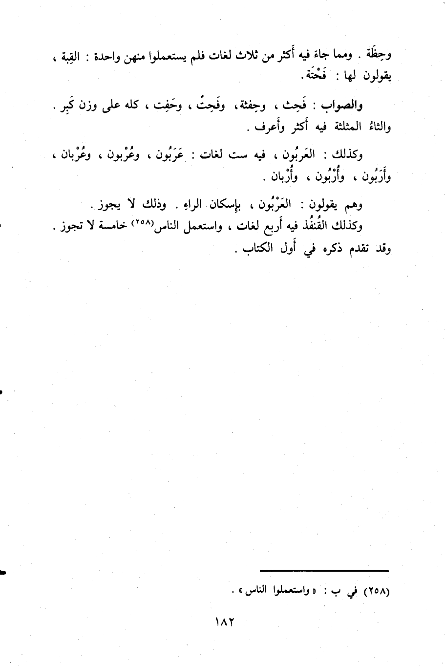 وكذلك: العربون، فيه ست لغات: عربون، وعربون، وعربان، وأربون، وأربون، وأربان.
