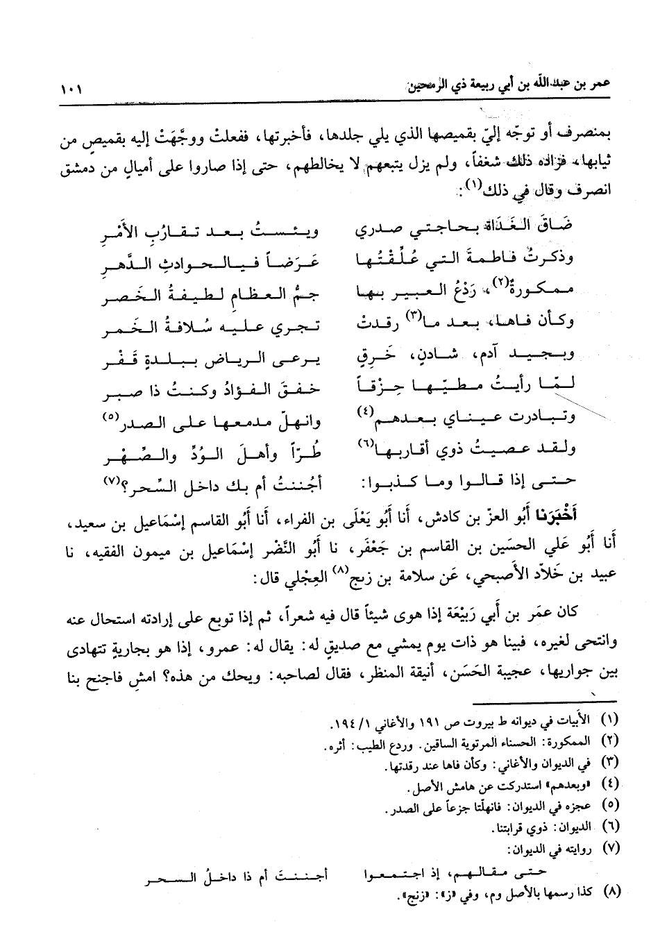 بمنصرف أو توجه إلي بقميصها الذي يلي جلدها فأخبرتها ففعلت ووجهت إليه بقميص من ثيابها فزاده ذلك شغفا ولم يزل يتبعهم لا يخالطهم حتى إذا صاروا على أميال من دمشق انصرف وقال في ذلك (1) * ضاق الغداة بحاجتي صدري * ويئست بعد تقارب الأمر وذكرت فاطمة التي علقتها * عرضا في الحوادث الدهر ممكورة (2) ردع العبير بها * جم العظام لطيفة الخصر وكأن فاها بعد ما (3) رقدت * تجري عليه سلافة الخمر وبجيد آدم شادن خرق * يرعى الرياض ببلدة قفر لما رأيت مطيها حزقا * خفق الفؤاد وكنت ذا صبر وتبادرت عيناي بعدهم (4) * وانهل مدمعها على الصدر (5) ولقد عصيت ذوي أقاربها * طرا وأهل الود والصهر حتى إذا قالوا وما كذبوا * أجننت أم بك داخل السحر * أخبرنا أبو العز بن كادش أنا أبو يعلى بن الفراء أنا أبو القاسم إسماعيل بن سعيد أنا أبو علي الحسين بن القاسم بن جعفر نا أبو النضر إسماعيل بن ميمون الفقيه نا عبيد بن خلاد الأصبحي عن سلامة بن زنج (8) العجلي قال كان عمر بن أبي ربيعة إذا هوى شيئا قال فيه شعرا ثم إذا توبع على إرادته استحال عنه وانتحى لغيره فبينا هو ذات يوم يمشي مع صديق له يقال له عمرو إذا هو بجارية تتهادى بين جواريها عجيبة الحسن أنيقة المنظر فقال لصاحبه ويحك من هذه امش فاجنح بنا