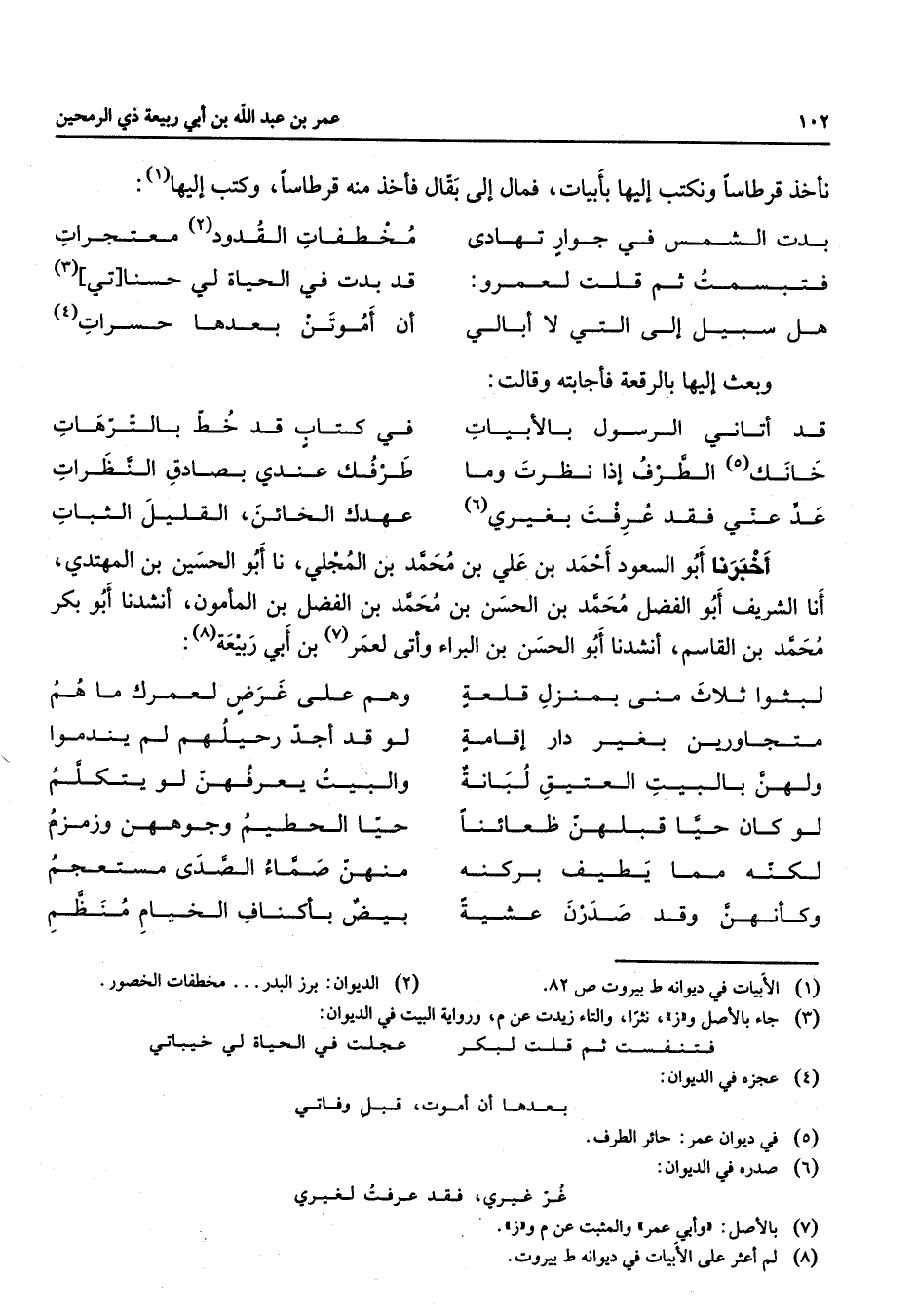 نأخذ قرطاسا ونكتب إليها بأبيات فمال إلى بقال فأخذ منه قرطاسا وكتب إليها (1) * بدت الشمس في جوار تهادى * مخطفات القدود (2) معتجرات فتبسمت ثم قلت لعمرو * قبدت في الحياة لي حسناتي (3) هل سبيل إلى التي لا أبالي * أن أموتن بعدها حسرات (4) وبعث إليها بالرقعة فأجابته وقالت * قد أتاني الرسول بالأبيات * في كتاب قد خط بالترهات خانك (5) الطرف إذا نظرت وما * طرفك عندي بصادق النظرات عدعني فقد عرفت بغيري (6) * عهدك الخائن القليل الثبات * أخبرنا أبو السعود أحبن علي بن المجلي نا أبو الحسين بن المهتدي أنا الشريف أبو الفضل محمد بن الحسن بن محمد بن الفضل بن المأمون أنشدنا أبو بكر محمد بن القاسم أنشدنا أبو الحسن بن البراء وأتى لعمر (7) بن أبي ربيعة (8) * لبثوا ثلاث منى بمنزل قلعة * وهم على غرض لعمرك ما هم متجاورين بغير دار إقامة * لو قد أجد رحيلهم لم يندموا ولهن بالبيت العتيق لبانة * والبيت يعرفهن لو يتكلم لو كان حيا قبلهن ظعائنا * حيا الحطيم وجوههن وزمزم لكنه مما يطيف بركنه * منهن صماء الصدى مستعجم وكأنهن وقد صدرن عشية * بيض بأكناف الخيام منظم