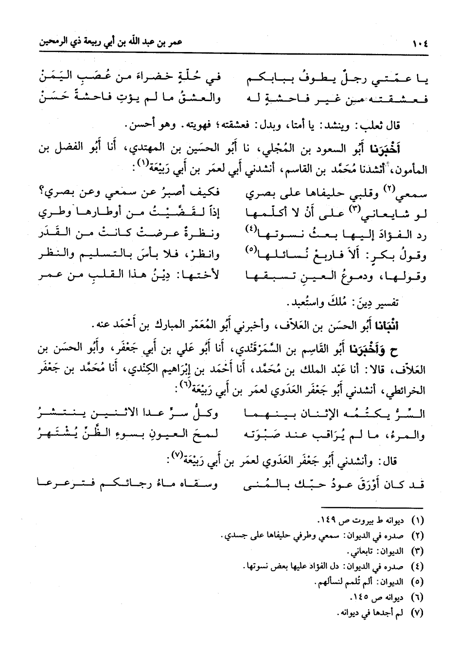 يا عمتي رجل يطوف بباكم * في حلة خضراء من عصب اليمن فعشقته من غير فاحشة له * والعشق ما لم يؤت فاحشة حسن * قال ثعلب وينشد يا أمتا وبدل فعشقته فهويته وهو أحسن أخبرنا أبو السعود بن المجلي نا أبو الحسين بن المهتدي أنا أبو الفضل بن المأمون أنشدنا محمد بن القاسم أنشدني أبي لعمر بن أبي ربيعة (1) * سمعي (2) وقلبي حليفاها على بصري * فكيف أصبر عن سمعي وعن بصري لو شايعاني (3) على أن لا أكلمها * إذا لقضيت من أوطارها وطري رد الفؤاد إليها بعث نسوتها (4) * ونظرة عرضت كانت من القدر وقول بكر ألا فاربع نسائلها (5) * وانظر فلا بأس بالتسليم والنظر وقولها ودموع العين تسبقها * لأختها دين هذا القلب من عمر * تفسير دين ملك واستعبد أنبأنا أبو الحسن بن العلاف وأخبرني أبو المعمر المبارك بن أحمد عنه ح وأخبرنا أبو القاسم بن السمرقندي أنا أبو علي بن أبي جعفر وأبو الحسن بن العلاف قالا أنا عبد الملك بن محمد أنا أحمد بن إبراهيم الكندي أنا محمد بن جعفر الخرائطي أنشدني أبو جعفر العدوي لعمر بن أبي ربيعة (6) * السر يكتمه الإثنان بينهما * وكل سر عدا الإثنين ينتشر والمرء ما لم يراقب عند صبوته * لمح العيون بسوء الظن يشتهر * قال وأنشدني أبو جعفر العدو لعمر بن أبي ربيعة (7) * قد كان أورق عود حبك بالمنى * وسقاه ماء رجائكم فترعرعا
