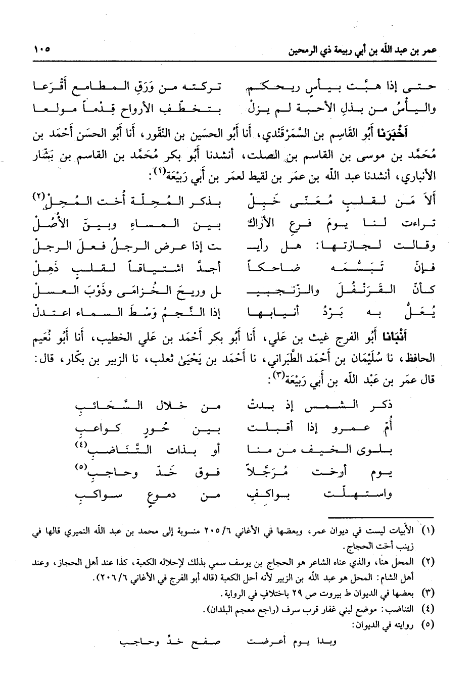 حتى إذا هبت بيأس ريحكم * تركته من ورق المطامع أقرعا واليأس من بذل الأحبة لم يزل * بتخطف الأرواح قدما مولعا * أخبرنا أبو القاسم بن السمرقندي أنا أبو الحسين بن النقور أنا أبو الحسن أحمد بن محمد بن موسى بن القاسم بن الصلت أنشدنا أبو بكر محمد بن القاسم بن بشار الأنباري أنشدنا عبد الله بن عمر بن لقيط لعمر بن أبي ربيعة (1) * ألا من لقلب معنى خبل * بذكر المحلة أخت المحل (2) تراءت لنا يوم فرع الأراك * بين المساء وبين الأصل وقالت لجارتها هل رأيت * إذا عرض الرجل فعل الرجل فإن تبسمه ضاحكا * أجد اشتياقا لقلب ذهل كأن القرنفل والزنجبيل * وريح الخزامى وذوب العسل يعل به برد أنيابها * إذ النجم وسط السماء اعتدل * أنبأنا أبو الفرج غيث بن علي أنا أبو بكر أحمد بن علي الخطيب أنا أبو نعيم الحافظ نا سليمان بن أحمد الطبراني نا أحمد بن يحيى ثعلب نا الزبير بن بكار قال قال عمر بن عبد الله بن أبي ربيعة (3) * ذكر الشمس إذ بدت * من خلال السحائب أم عمرو إذا أقبلت * بين حور كواعب بلوى الخيف من منا * بذات التناضب (4) يوم أرخت مرجلا * فوق خد وحاجب (5) واستهلت بواكف * من دموع سواكب