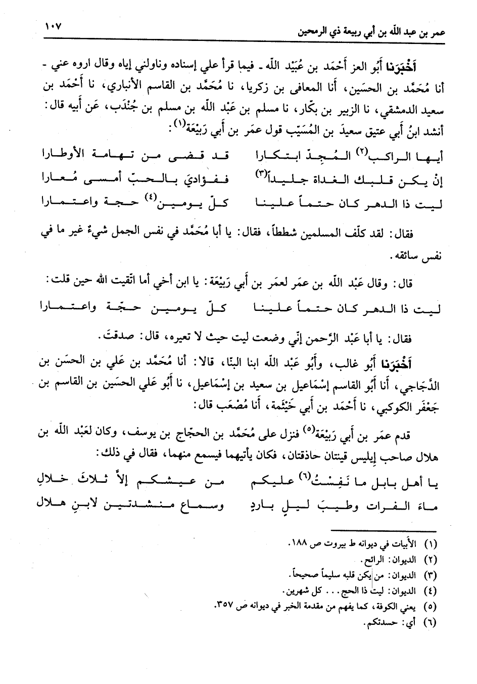 أخبرنا أبو العز أحمد بن عبيد الله فيما قرأ علي إسناده وناولني إياه وقال اروه عني أنا محمد بن الحسين أنا المعافي بزكريا نا محمد بن القاسم الأنباري نا أحمد بن سعيد الدمشقي نا الزبير بن بكار نا مسلم بن عبد الله بن مسلم بن جندب عن أبيه قال أنشد ابن أبي عتيق سعيد بن المسيب قول عمر بن أبي ربيعة (1) * أيها الراكب (2) المجد ابتكارا * قد قضى من تهامة الأوطارا إن يكن قلبك الغداة جليدا (3) * ففؤادي بالحب أمسى معارا ليت ذاالدهر كان حتما علينا * كل يومين (4) حجة واعتمارا * فقال لقد كلف المسلمين شططا فقال يا أبا محمد في نفس الجمل شئ غير ما في نفس سائقه قال وقال عبد الله بن عمر لعمر بن أبي ربيعة يا ابن أخي أما اتقيت الله حين قلت * ليت ذا الدهر كاحتما علينا * كل يومين حجة واعتمارا * فقال يا أبا عبد الرحمن إني وضعت ليت حيث لا تعيره قال صدقت أخبرنا أبو غالب وأبو عبد الله ابنا البنا قالا أنا محمد بن علي بن الحسن بن الدجاجي أنا أبو القاسم إسماعيل بن سعيد بن إسماعيل نا أبو علي الحسين بن القاسم بن جعفر الكوكبي نا أحمد بن أبي خيثمة أنا مصعب قال قدم عمر بن أبي ربيعة (5) فنزل على محمد بن الحجاج بن يوسف وكان لعبد الله بن هلال صاحب إيليس قينتان حاذقتان فكان يأتيهما فيسمع منهما فقال في ذلك * يا أهل بابل ما نفست (6) عليكم * من عيشكم إلا ثلاث خلال ماء الفرات وطيب ليل بارد * وسماع منشدتين لابن هلال *