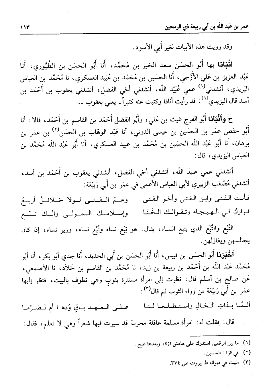 وقد رويت هذه الأبيات لغير أبي الأسود أنبأنا بها أبو الحسن سعد الخير بن محمد أنا أبو الحسن بن الطيوري أنا عبد العزيز بن علي الأزجي أنا الحسين بن محمد بن عبيد العسكري نا محمد بن العباس اليزيدي أنشدني (1) عمي عبيد الله أنشدني أخي الفضل أنشدني يعقوب بن أحمد بن أسد قال اليزيدي (1) قد رأيت أناذا وكتبت عنه كثيرا يعني يعقوب ح وأنبأنا أبو الفرج غيث بن علي وأبو الفضل أحمد بن القاسم بن أحمد قالا أنا أبو حفص عمر بن الحسين بن عيسى الدوني أنا عبد الوهاب بن الحسن بن عمر بن برهان نا أبو عبد الله الحسين بن محمد بن عبيد العسكري أنا أبو عبد الله محمد بن العباس اليزيدي قال أنشدني عمي عبيد الله أنشدني أخي الفضل أنشدني يعقوب بن أحمد بن أسد أنشدني مصعب الزبيري لأبي العباس الأعمى في عمر بن أبي ربيعة * فأنت الفتى وابن الفتى وأخو الفتى * وعم الفتى لولا خلائق أربع فرارك في الهيجاء وتقوالك الخنا * وإسلامك المولى وانك تبع * التبع والتبع الذي يتبع النساء يقال هو تبع نساء وتبع نساء وزير نساء إذا كان يجالسهن ويغازلهن أخبرنا أبو الحسن بن قبيس أنا أبو الحسن بن أبي الحديد أنا جدي أبو بكر أنا أبو محمد عبد الله بن أحمد بن ربيعة بن زيد نا محمد بن القاسم بن خلاد نا الأصمعي عن صالح بن أسلم قال نظرت إلى امرأة مستترة بثوب وهي تطوف بالبيت فنظر إليها عمر بن أبي ربيعة من وراء الثوب ثم قال (3) * ألما بذات الخال واستطلعا لنا * على العهد باق ودها أم تصرما * قال فقلت له امرأة مسلمة عاقلة محرمة قد سيرت فيها شعرا وهي لا تعلم فقال