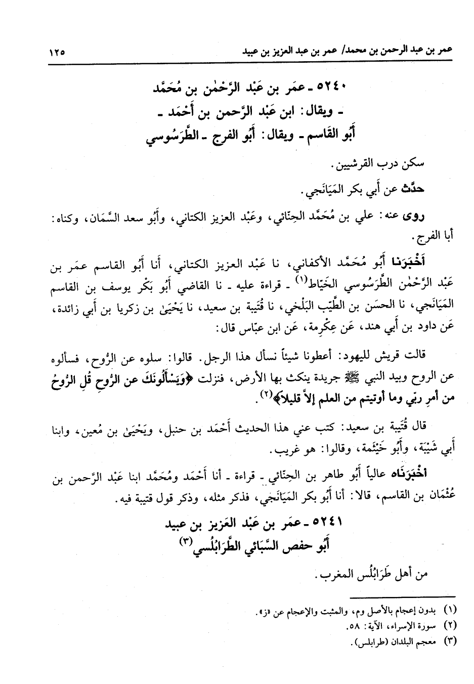5240 - عمر بن عبد الرحمن بن محمد ويقال ابن عبد الرحمن بن أحمد أبو القاسم ويقال أبو الفرج الطرسوسي سكن درب القرشيين حدث عن أبي بكر الميانجي روى عنه علي بن محمد الحنائي وعبد العزيز الكتاني وأبو سعد السمان وكناه أبا الفرج أخبرنا أبو محمد الأكفاني نا عبد العزيز الكتاني أنا أبو القاسم عمر بن عبد الرحمن الطرسوسي الخياط (1) قراءة عليه نا القاضي أبو بكر يوسف بن القاسم الميانجي نا الحسن بن الطيب البلخي نا قتيبة بن سعيد نا يحيى بن زكريا بن أبي زائدة عن داود بن أبي هند عن عكرمة عن ابن عباس قال قالت قريش لليهود أعطونا شيئا نسأل هذا الرجل قالوا سلوه عن الروح فسألوه عن الروح وبيد النبي (صلى الله عليه وسلم) جريدة ينكث بها الأرض فنزلت " ويسألونك عن الروح قل الروح من أمر ربي وما أوتيتم من العلم إلا قليلا " (2) قال قتيبة بن سعيد كتب عني هذا الحديث أحمد بن حنبل ويحيى بن معين وابنا أبي شيبة وأبو خيثمة وقالوا هو غريب أخبرناه عاليا أبو طاهر بن الحنائي قراءة أنا أحمد ومحمد ابنا عبد الرحمن بن عثمان بن القاسم قالا أنا أبو بكر الميانجي فذكر مثله وذكر قول قتيبة فيه
